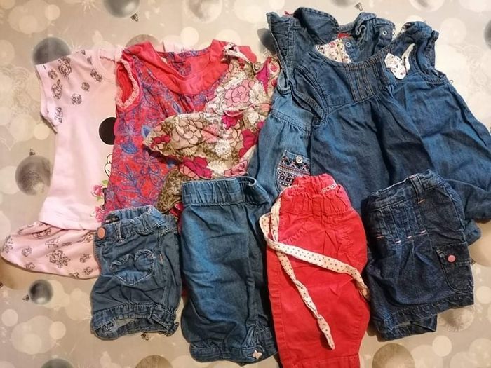 Lot de 34 pièces comprenant : - 7 leggings - 5 robes - 2 pantacourts - 1 pantalon - 1 short en jean - 1 jupe en jean - 2 hauts manches longues - 9 t-shirts manches courtes (ou sans manches) - 3 bodies manches courtes - 2 gilets - 1 boléro Le lot est en très bon état