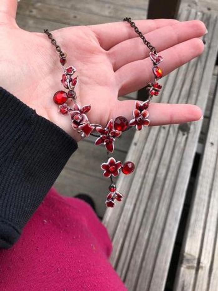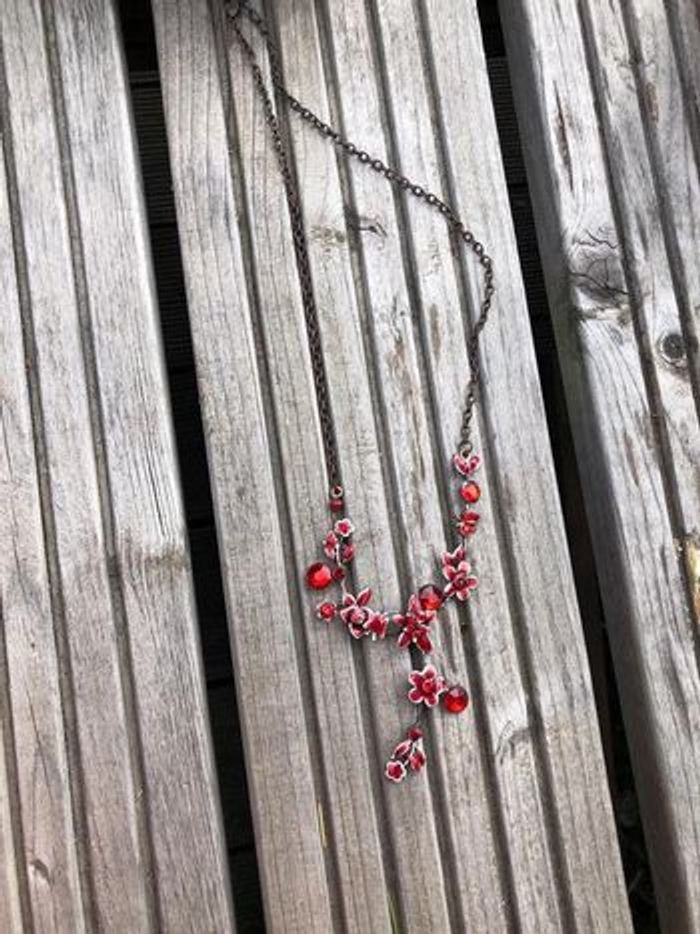 Collier fleur rouge vintage très bon état vu l’âge La taille ajustable est fausse bien évidement ;-)