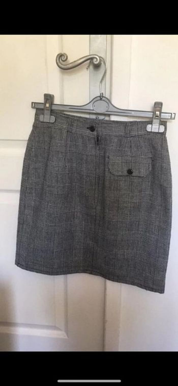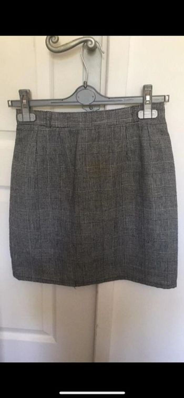jupe grise à carreau motif pied de poule avec doublure deux petite tache jaunes à l’arrière mais qui ne sont pas très gênantes (voir photo)