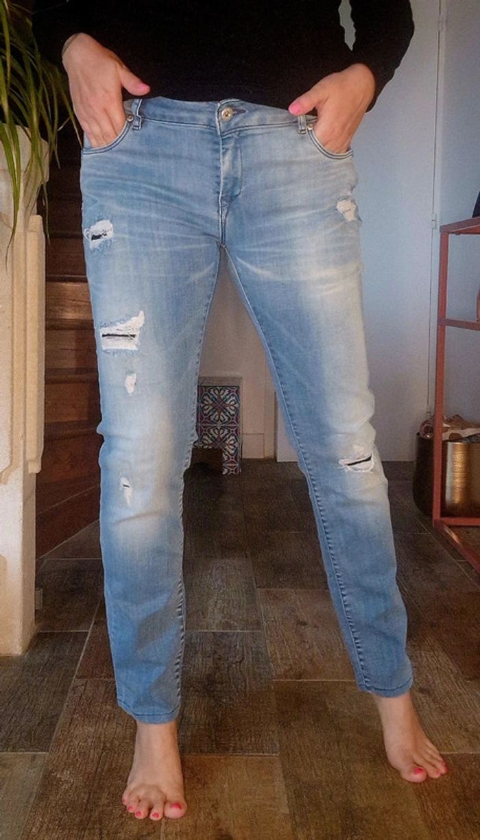 Coloris bleu clair avec effet de délavage Fiction usée, destroy d'origine avec détail (faux) trous Longueur 32