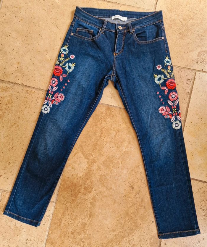 Broderies fleurs fleuries florales sur les côté de cuisses extérieurs Délavage très léger