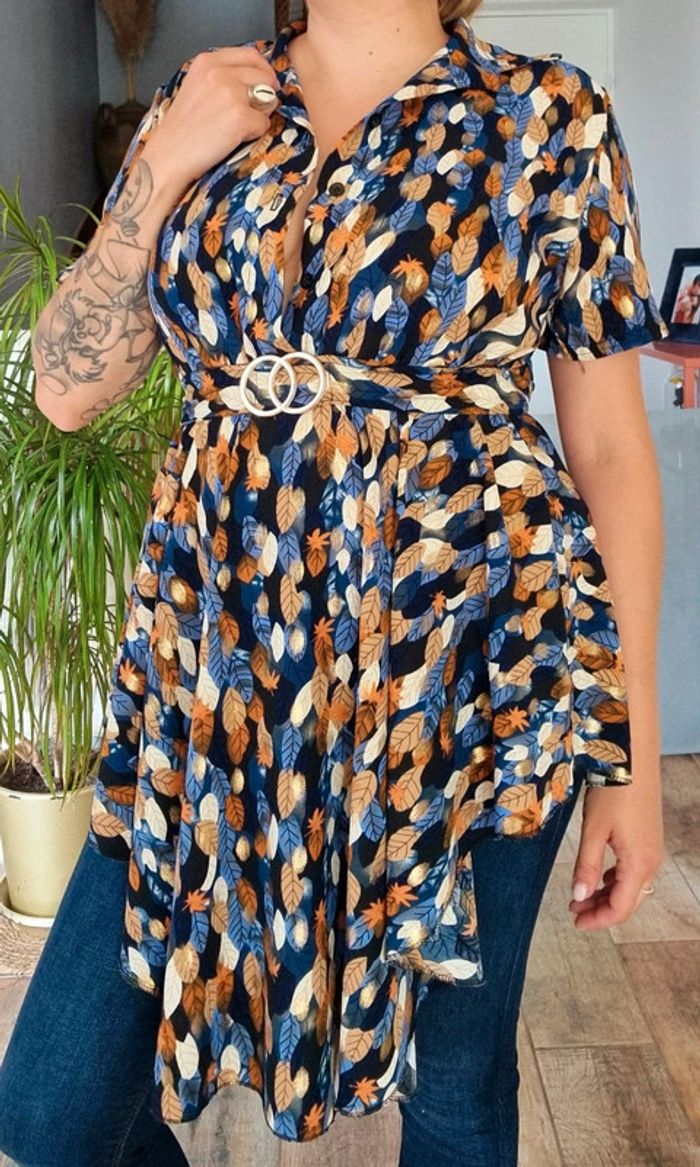 Serrage sous poitrine avec détail double boucle or Manches courtes et rangée de boutons au niveau de la poitrine Effet de drapé sur le devant Imprimée feuilles dans les tons bleus et orangés
