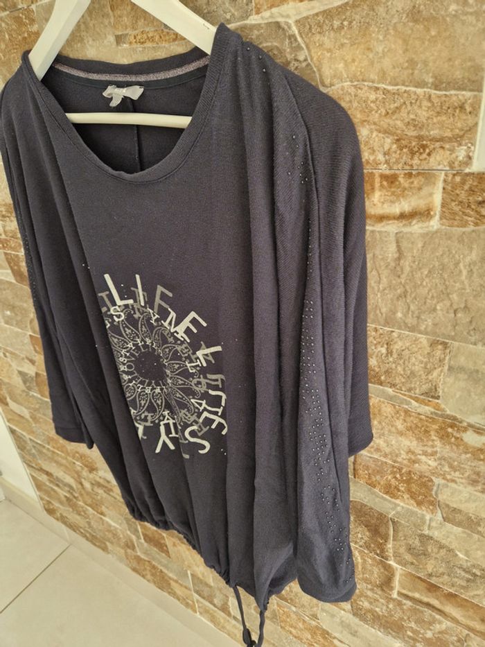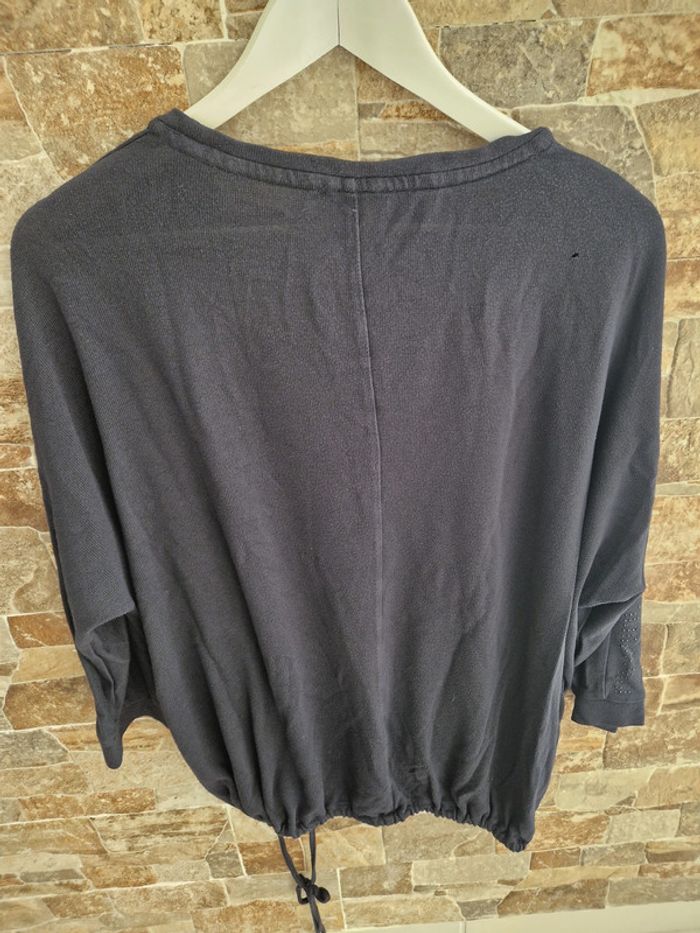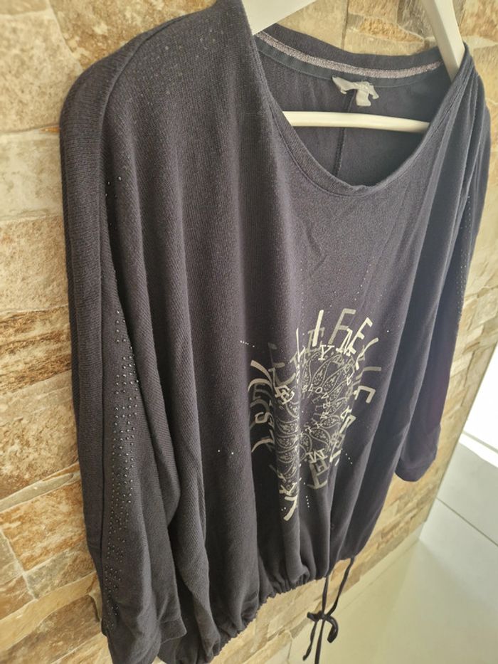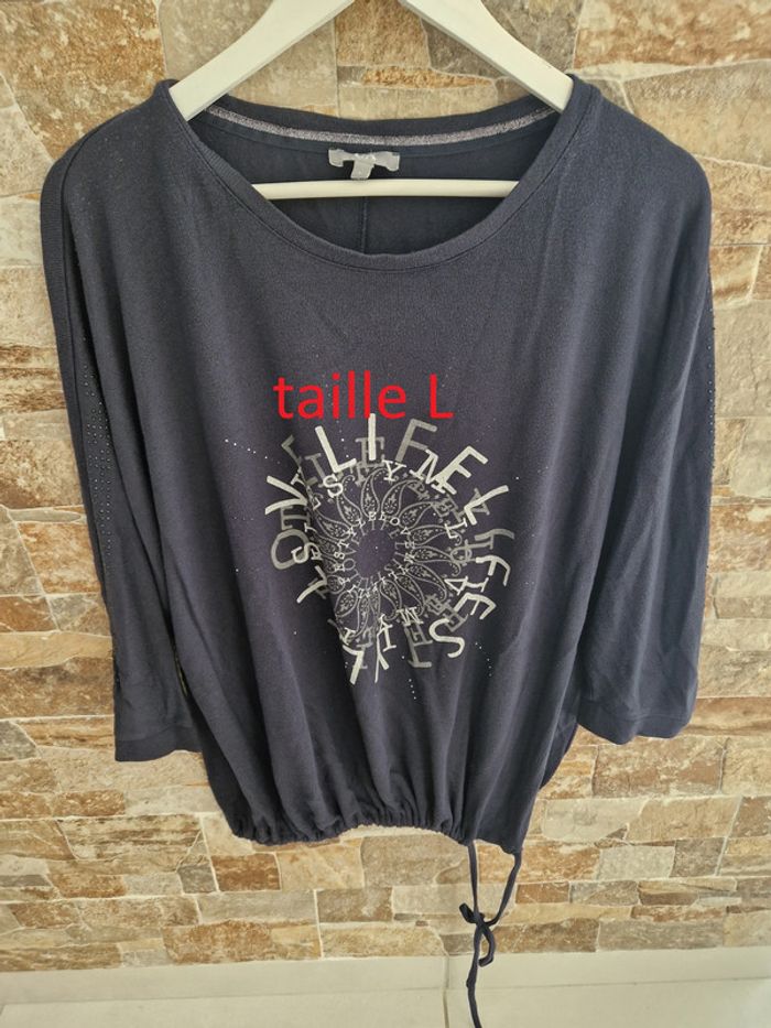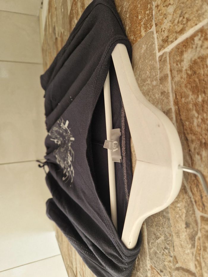 1 t-shirt manche longue taille L (taille tres grand) noir bleu marine marque C et A pour la mi saison ou hivers un cordon pour serrer vers le bas 1 petit trou dans le dos vers l'épaule possibilité de faire un point pr le réparer) petites perles noir sur le long des manches #laetie69_femmesTAILLE 46 #laetie69_femmesTAILLE48 #laetie69_femmesTAILLE50