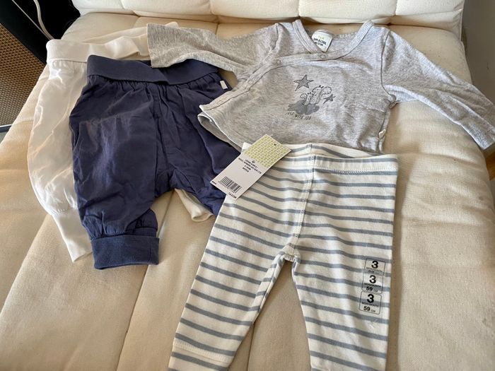 2 pantalons sarouels 1 blanc 1 bleu taille 1 mois 1 legging rayé bleu et blanc taille 3 mois 1 haut gris croisé taille 1 mois Neufs.
