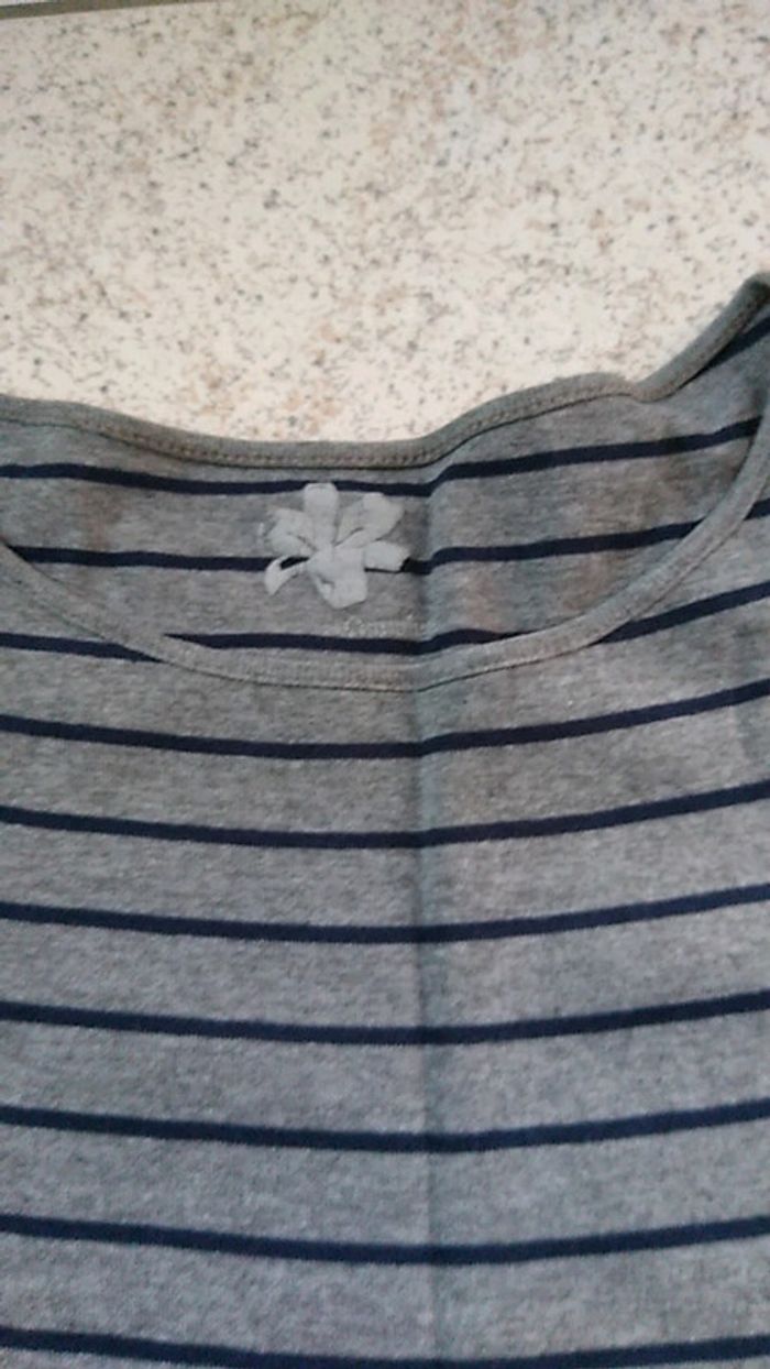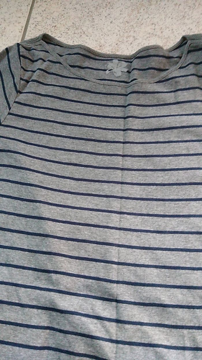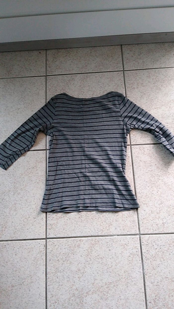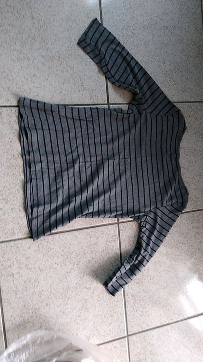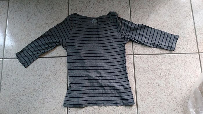 Joli pull rayé camaïeu gris et bleu manche 3/4 taille M.