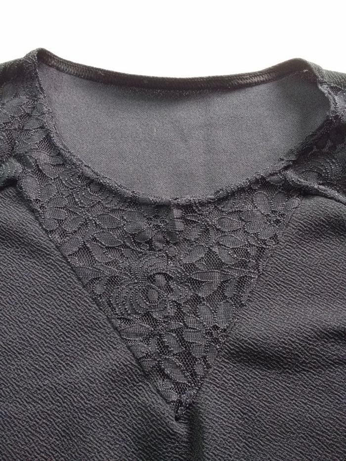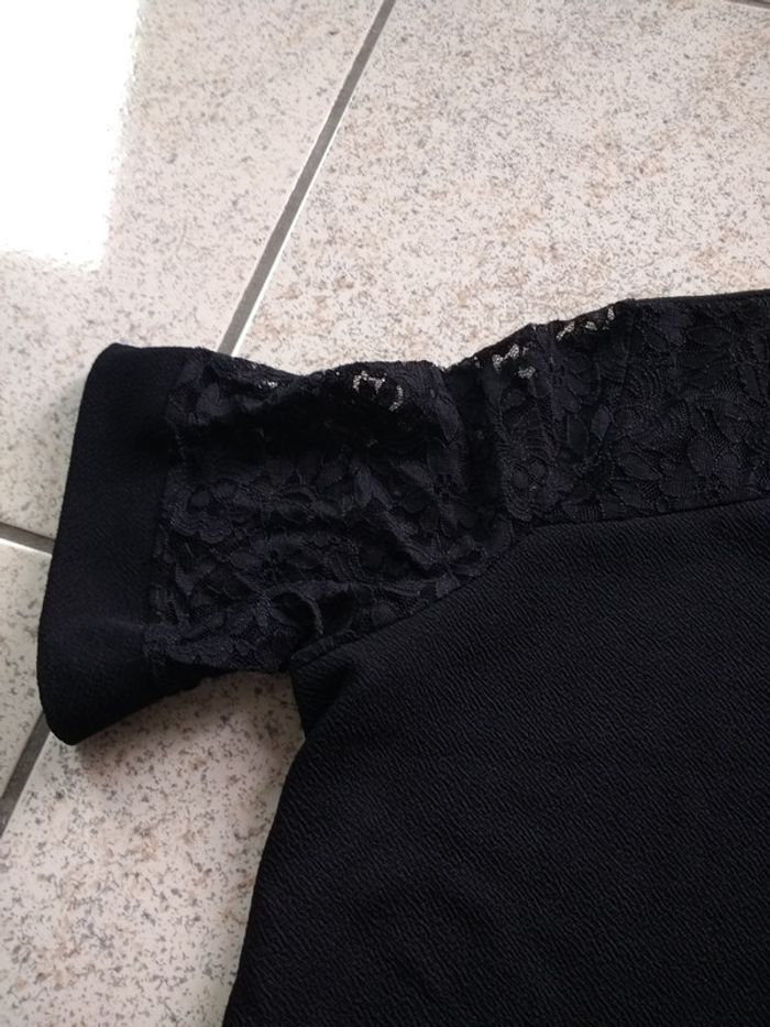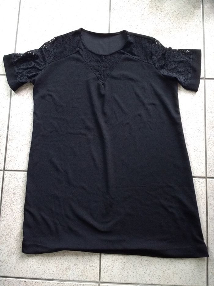 Jolie robe noire Kiabi taille 50 52 dentelle fleurie au col et aux manches. Fabriqué en France composition 94 % polyester 6 % élasthanne.