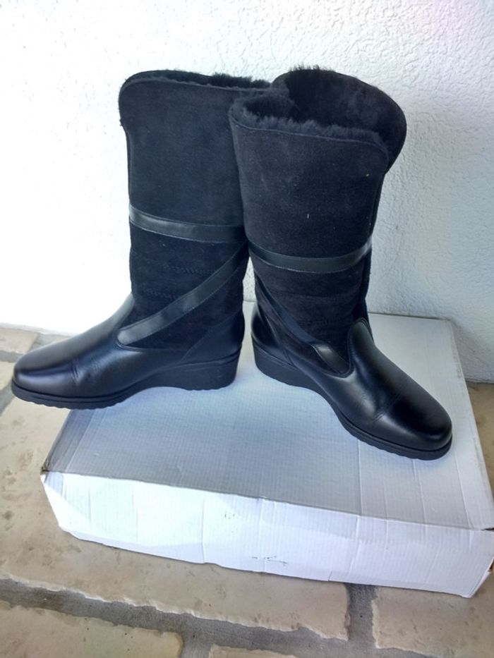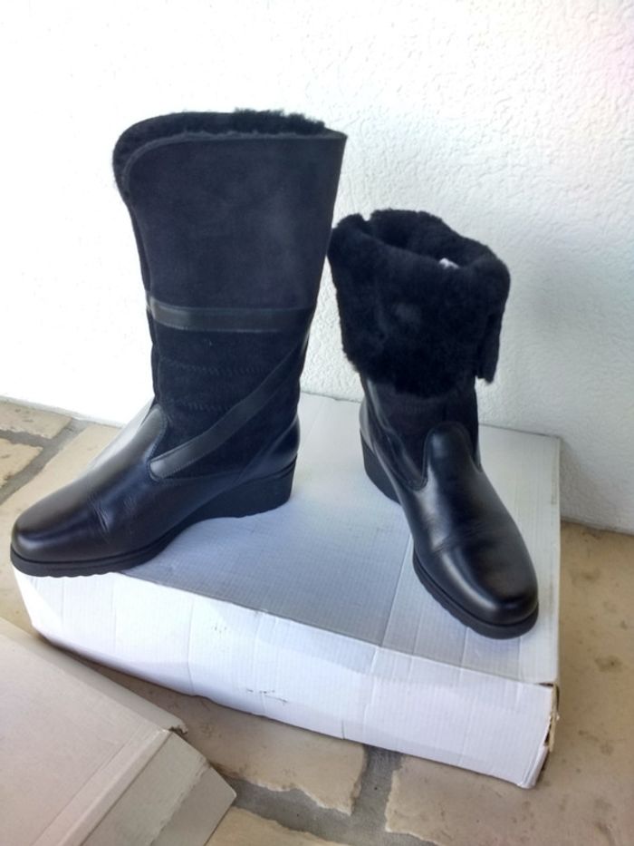 Paire de bottes modulables taille 35 de couleur noire fourrées en laine de mouton véritable portées une seule fois. Peuvent se porter droite ou retroussé en état impeccable. Valeur d'achat 115€