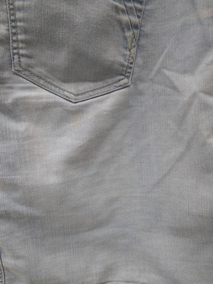 Jupe Grain de malice taille 42 couleur bleu ciel en jeans fermeture par zip et bouton. attention il y a 2 petites taches sur l'arrière de la jupe voir photos et le tissu est un peu usé en haut des poches voir photos.