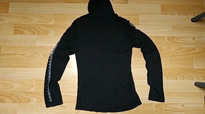 Pull col roulé de couleur noire 95 % viscose 5 % élasthanne avec strass sur les manches taille unique Correspond bien pour un s ou pour un m.