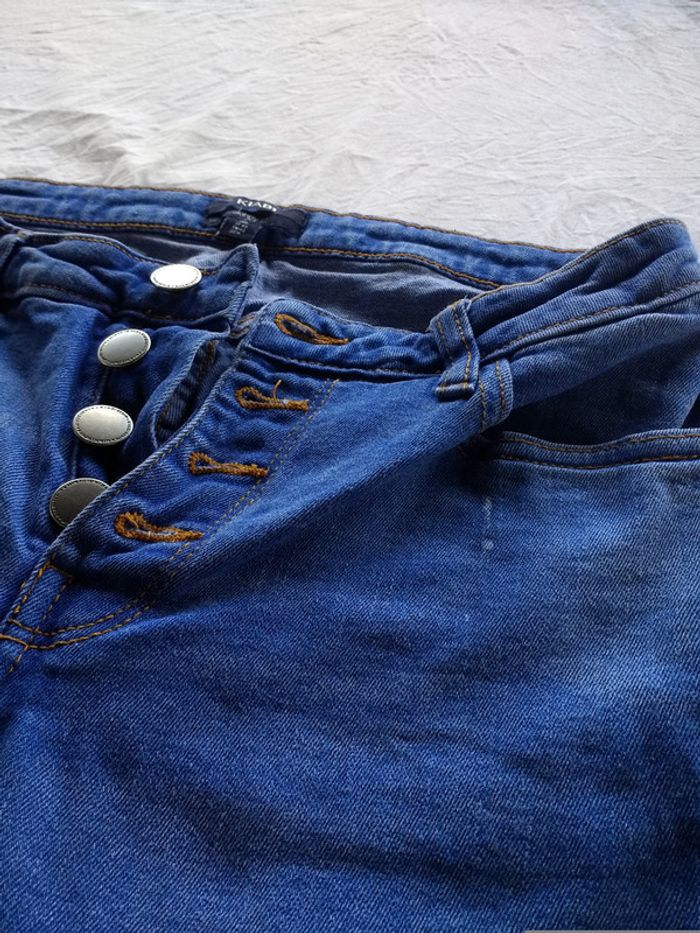 Jean bleu Kiabi skinny fit fermeture à boutons composition 99 % coton 1 pour 100 elasthanne. Petite décoloration visible sur les photos en dessous de la poche gauche. Bas du jeans à frange.