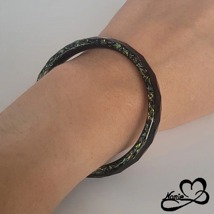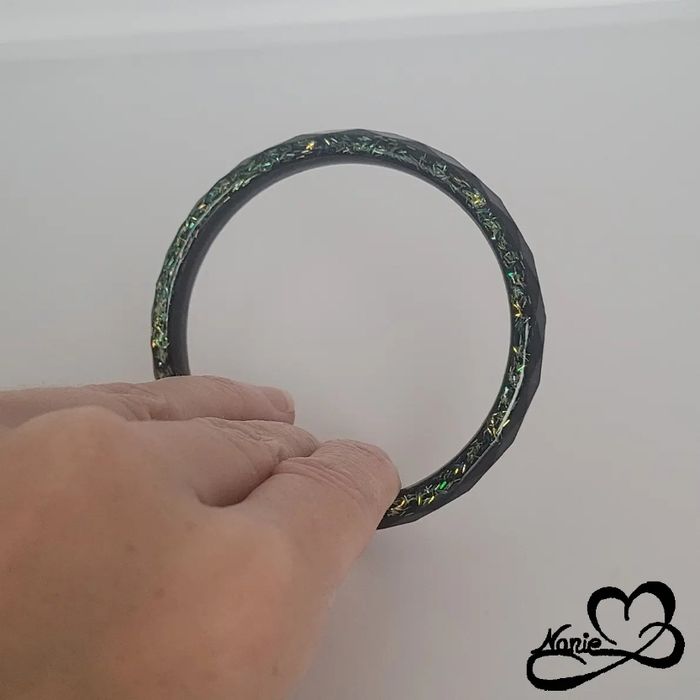 Ce Jonc Noir Pailleté en résine est unique et fait main. Le diamètre intérieur du jonc est de 5,8cm.