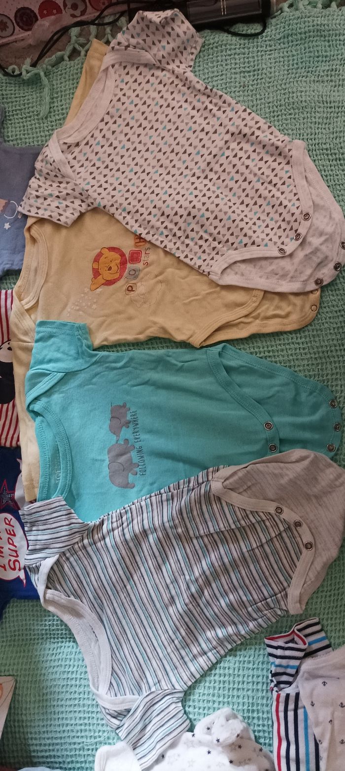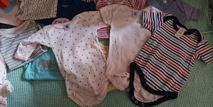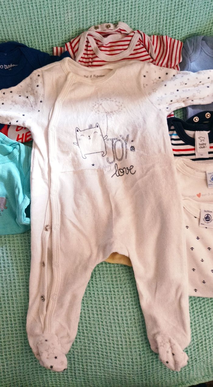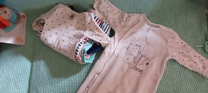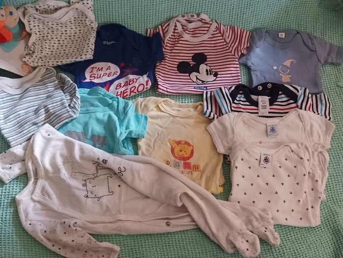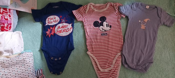 10 bodys dont 2 petit bateau ,2 Disney,4 tfk et un pyjamas velours kitchoun ( taille 62)