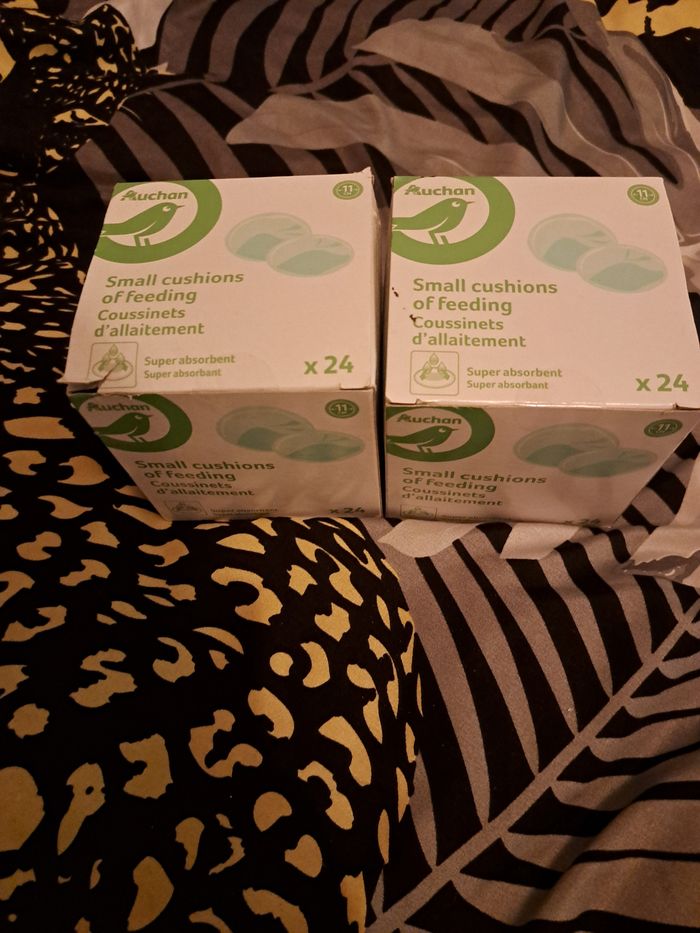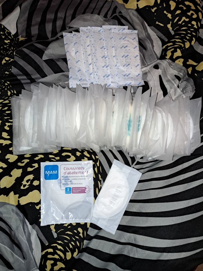 Ma fille est passée au biberon je revends donc 98 coussinets d'allaitement de différentes marques tous sont plastifiés individuellement. Jai 2 boites neuves de marque auchan 2x24 coussinets + 40 coussinets tex (carrefour) + 8 coussinets dodie + 2 coussinets MAM J'achetais en fonction de l'endroit où je faisait mes courses c'est pour ça que j'ai plusieurs marques mais je n'ai eu aucun soucis pas de fuite avec ces marques. Les 98 coussinets 7 euros.