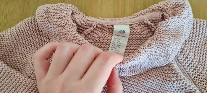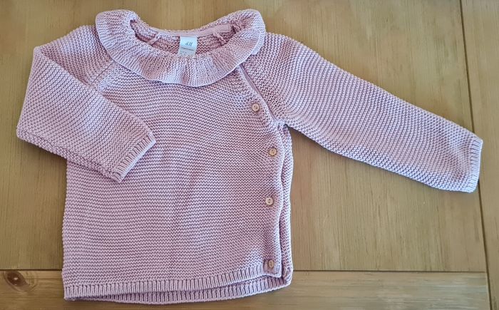 Mignon gilet en maille pour bébé de couleur rose avec un volant au niveau du col et des boutons sur le côté. État : Neuf sans étiquette Taille : 6-9 mois