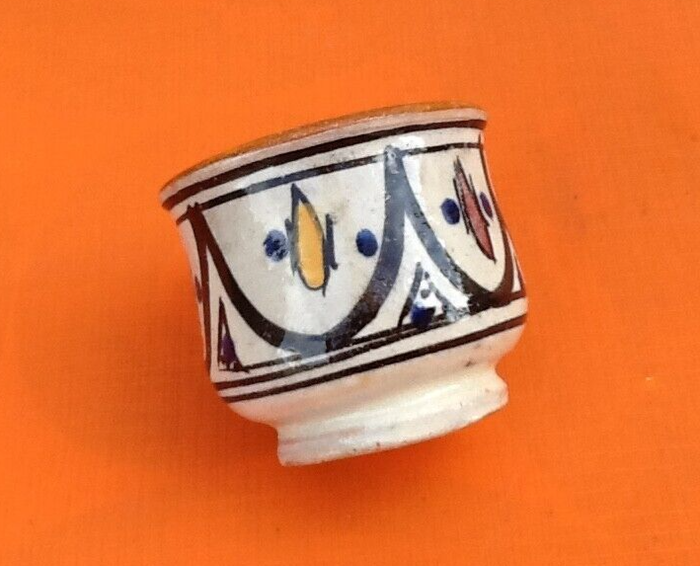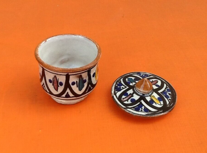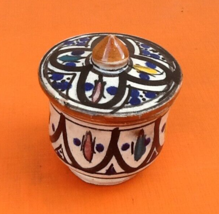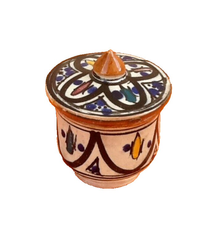 Années 1930-1940 Pot couvert (petit modèle) Poterie traditionnelle (Maroc) Hauteur totale : 80mm Diamètre : 60mm Poids : 105g