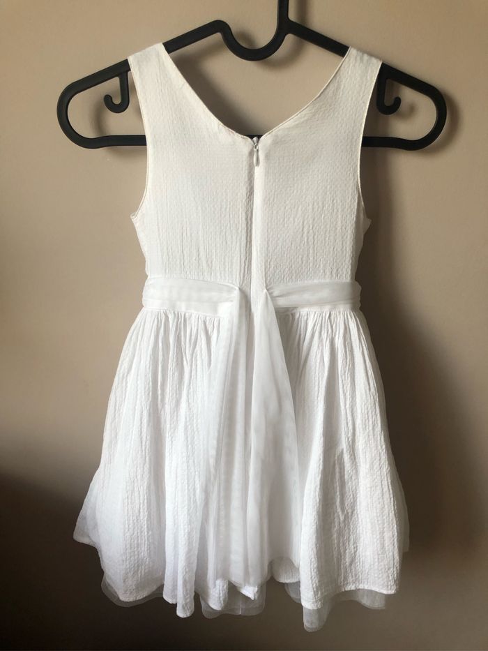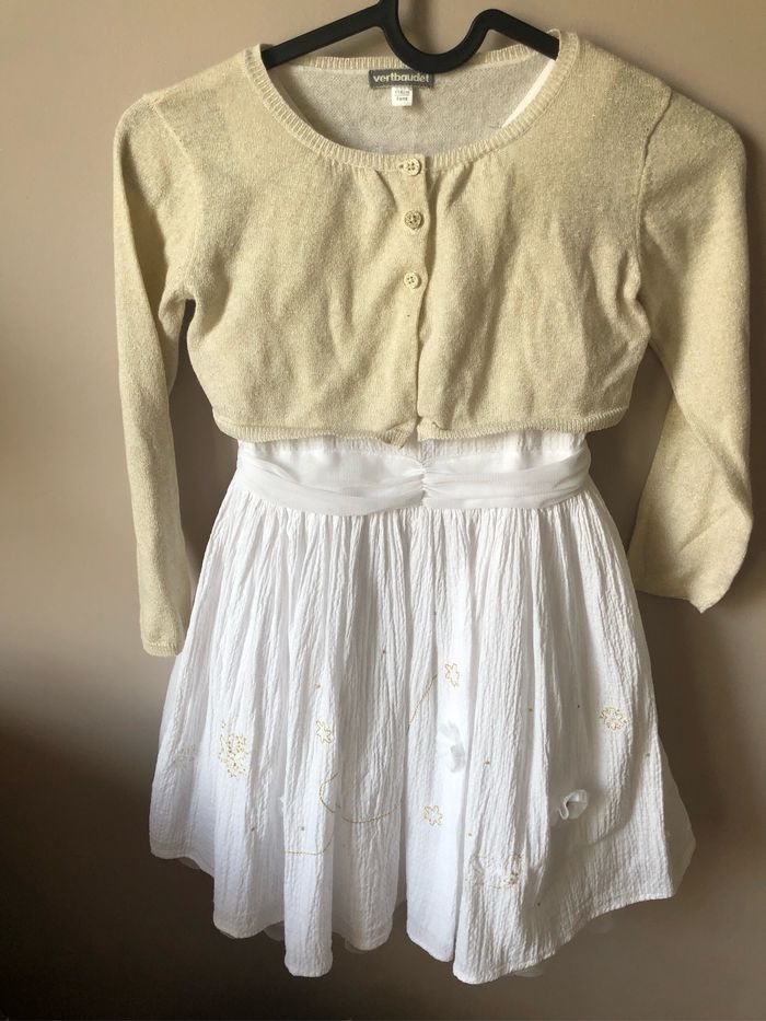 Robe de cérémonie orchestra portée seulement 2 fois : Blanche en gaze de coton, jupon en tulle blanc, détails dorés et petites fleurs en tulle blanc. Fermeture éclair dans le dos Pour compléter la tenue : Chapeau taille 51/52 vertbaudet Gilet court doré en 6 ans vertbaudet