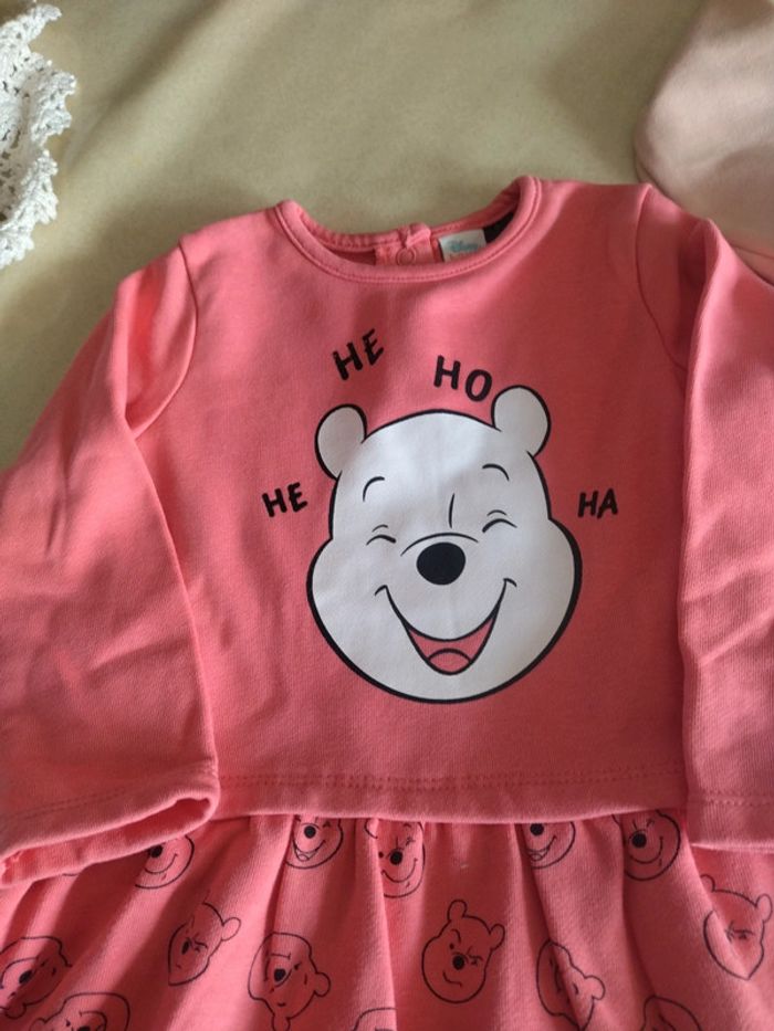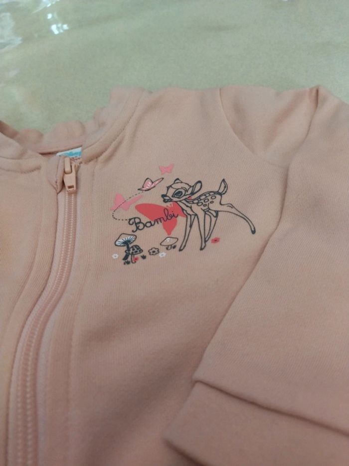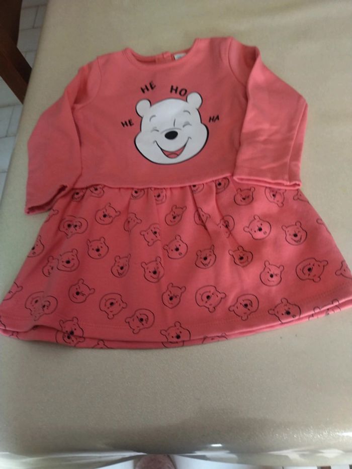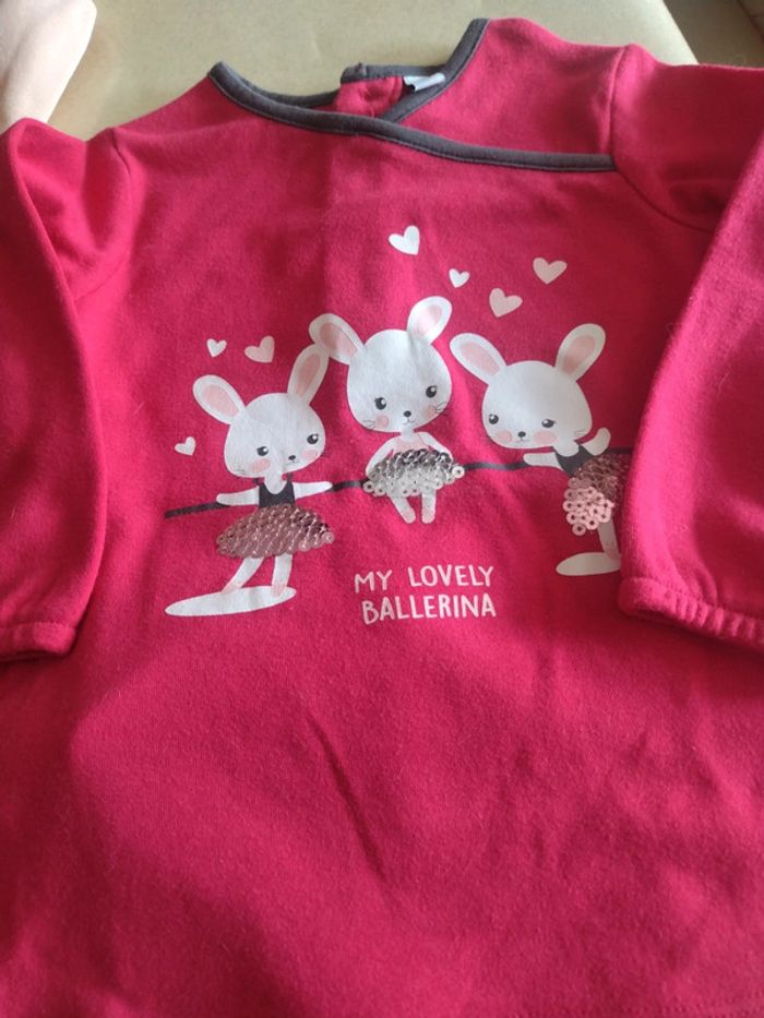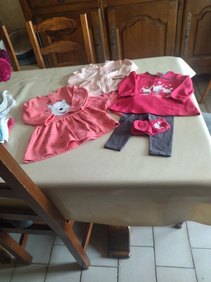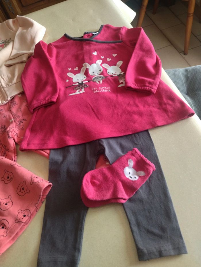 Une robe, 1 ensemble legging+ haut+ chaussettes, et 1 jogging avec veste à fermeture éclair saumon clair. Petites tâches sur les manches (voir dernières photos) En très bon état. Taille 74/80 cm.