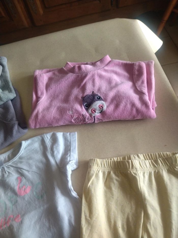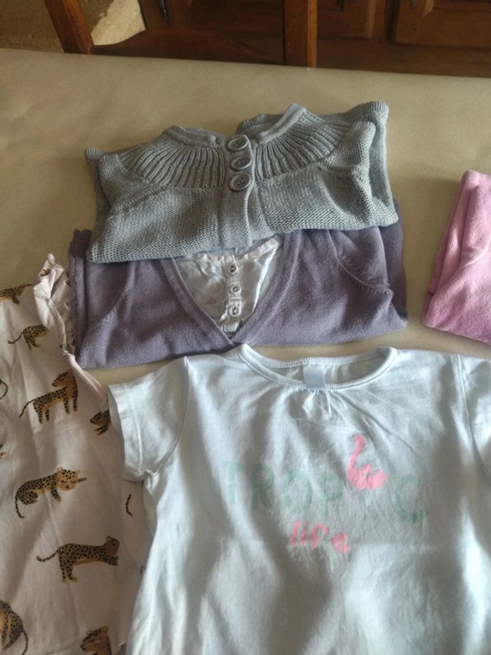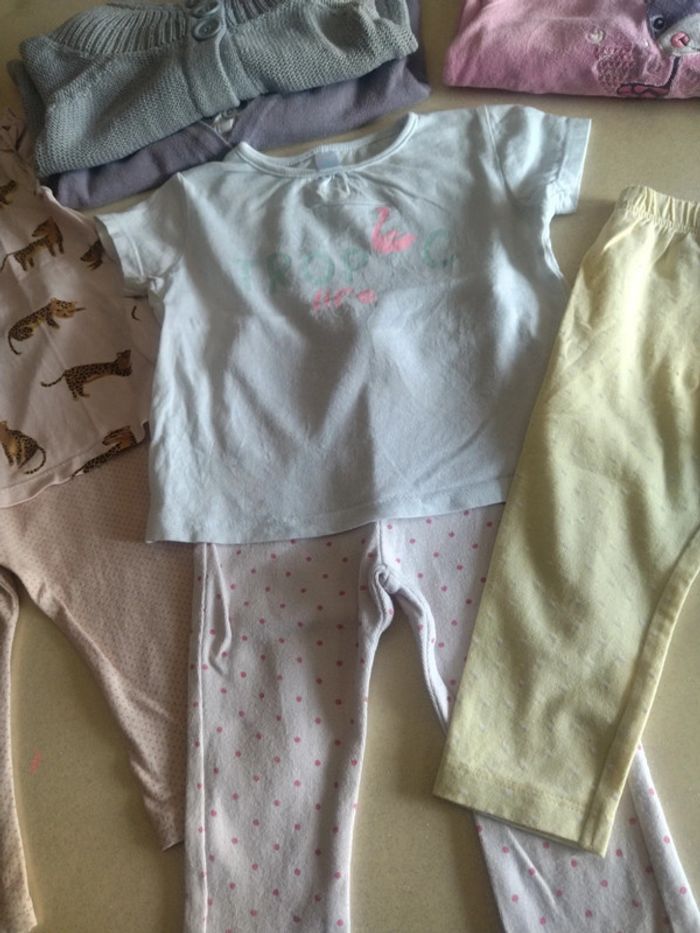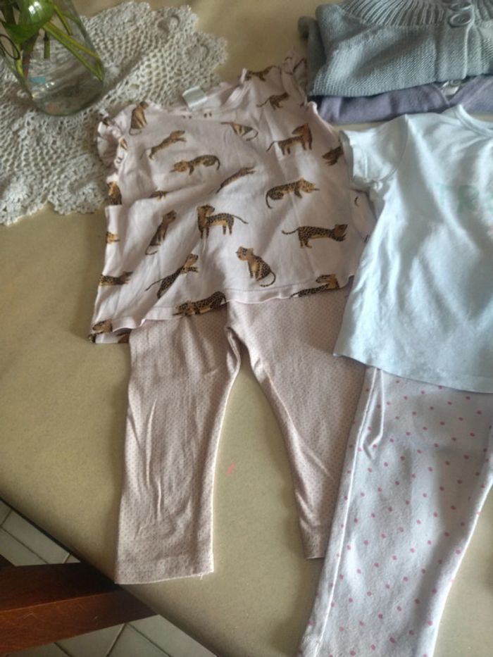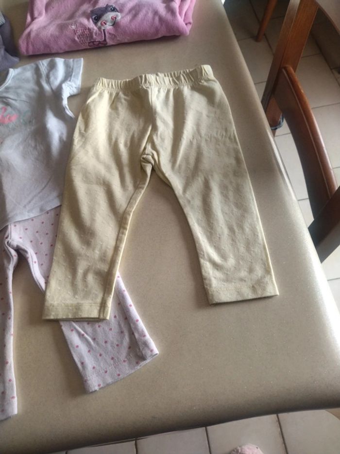 8 articles dont 2 ensembles leggings et haut, 1 legging, 2 gilets et 1 grenouillère. Très bon état Taille 9 mois. Voir dernière photo un tout petit point sur le haut de la jambe.