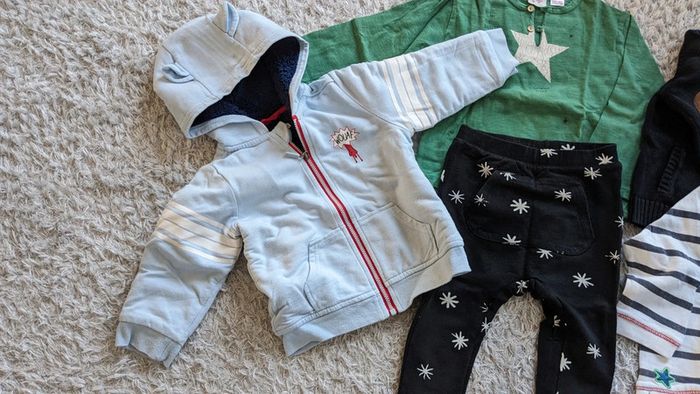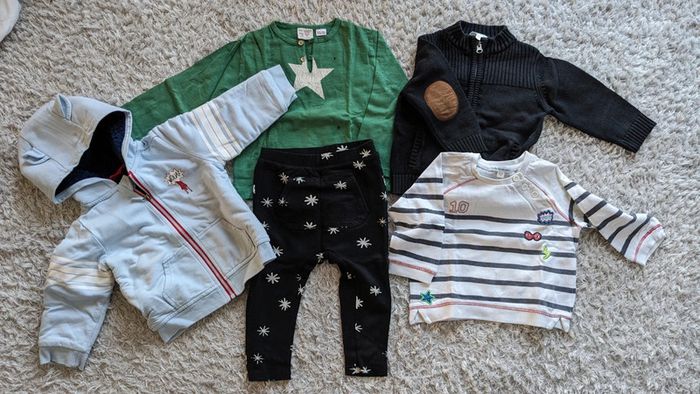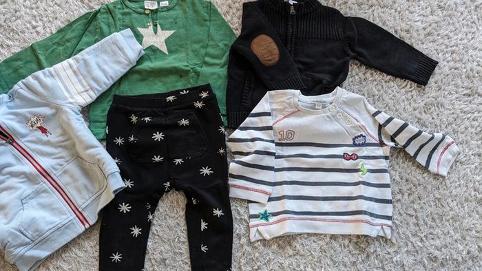 Lot de vêtements 2 ans (5 pièces) Sweat blanc Vertbaudet Gilet noir zippé Kiabi T-shirt + pantalon Zara Veste zippée Vertbaudet