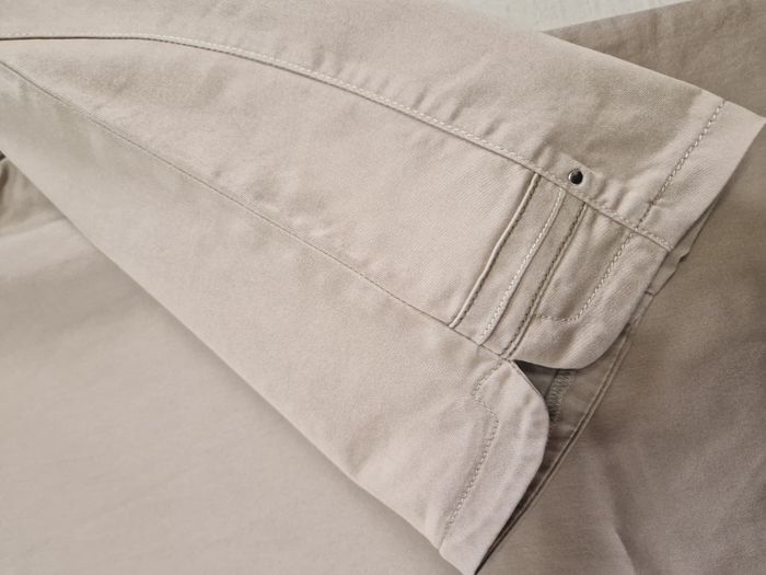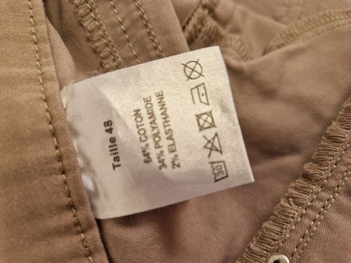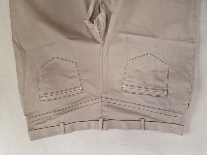Pantacourt Christine Laure coloris beige / mastic Fermeture à glissière + 1 bouton / passants à la ceinture, 3 poches avant + 2 derrière Décor couture repris sur les poches et à l'extrémité des jambes Taille 48, Longueur entrejambe : 61,5 cm Etat impeccable, comme neuf Prix boutique entre 80€ et 90€.