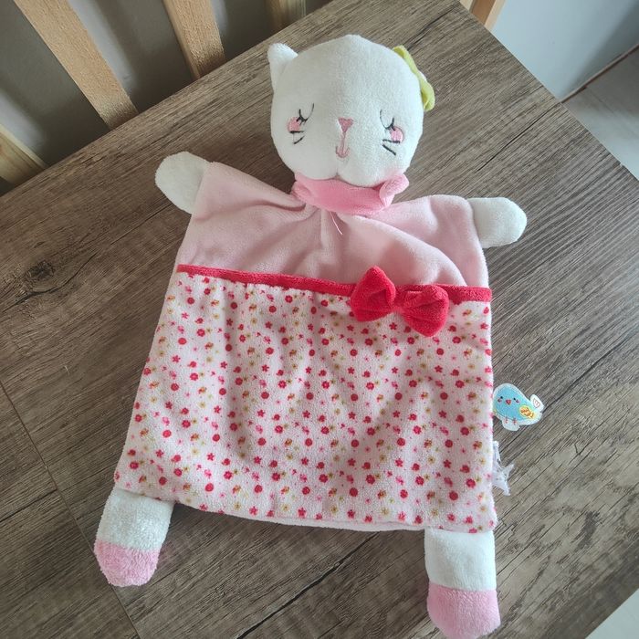 Mots d'enfants doudou chat plat rose rouge blanc noeud Tbe 13 euros Envoi en relais Étiquette de la marque coupée