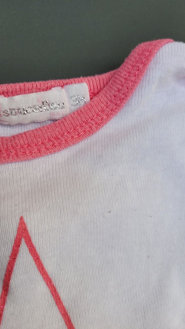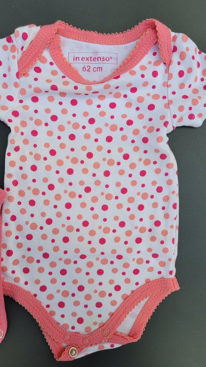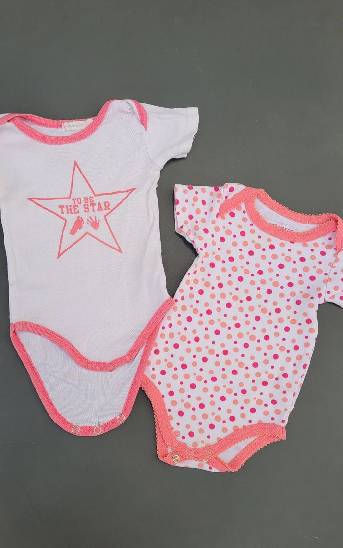 2 bodies manches courtes 3mois blanc/corail. Celui à pois In extenso est neuf, l'autre petit bobo à la pression du bas voir la photo.