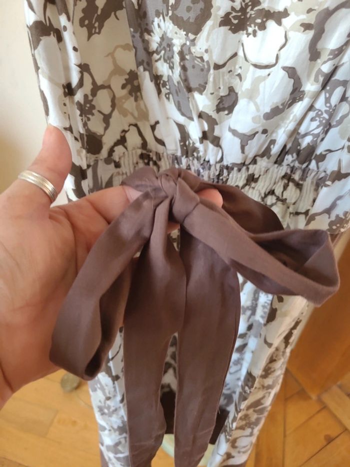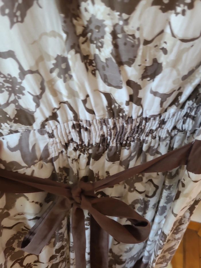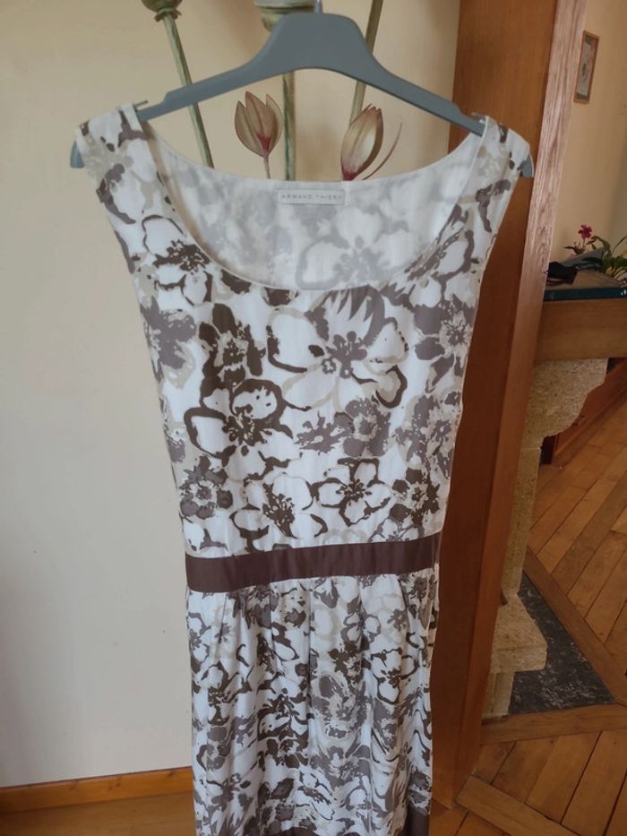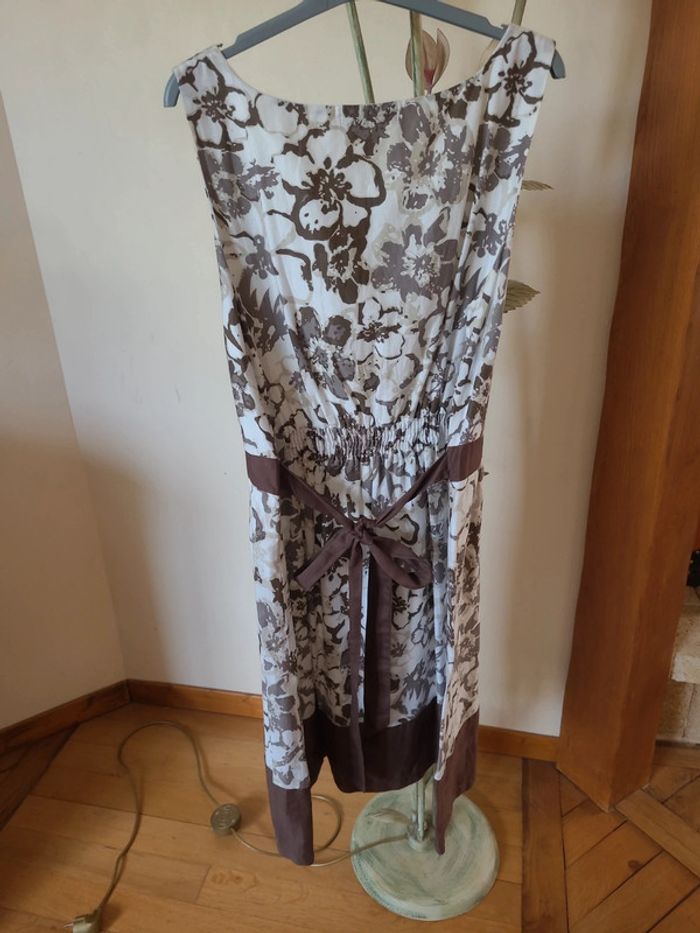 ⬇️mes autres annonces pour femme en taille 42 👉 #cg89femme42 😁 réductions activées des 2 articles ! une robe imprimé fleur dans les tons marrons, la taille est élastiquée au dos avec un lien à nouer. Elle est en coton et parfaite en toute occasion. Elle mesure 103 cm de longueur et 52 cm aux aisselles. Très bon état, taille 44, marque Armand Thiery #robedete #armandthiery #taille44