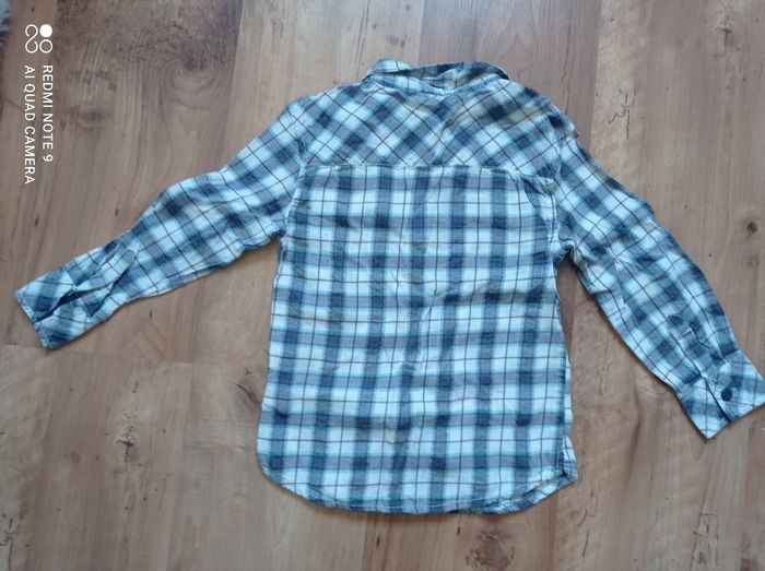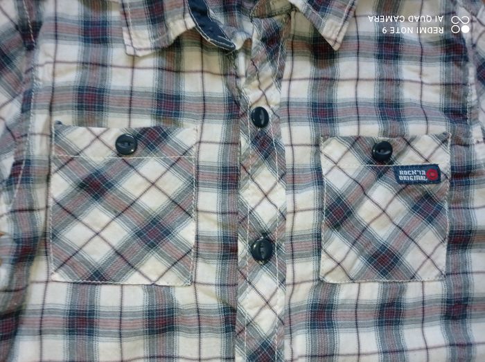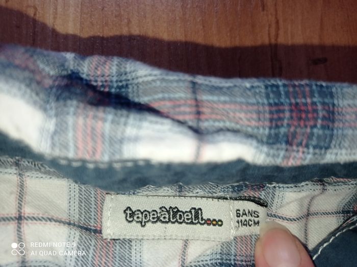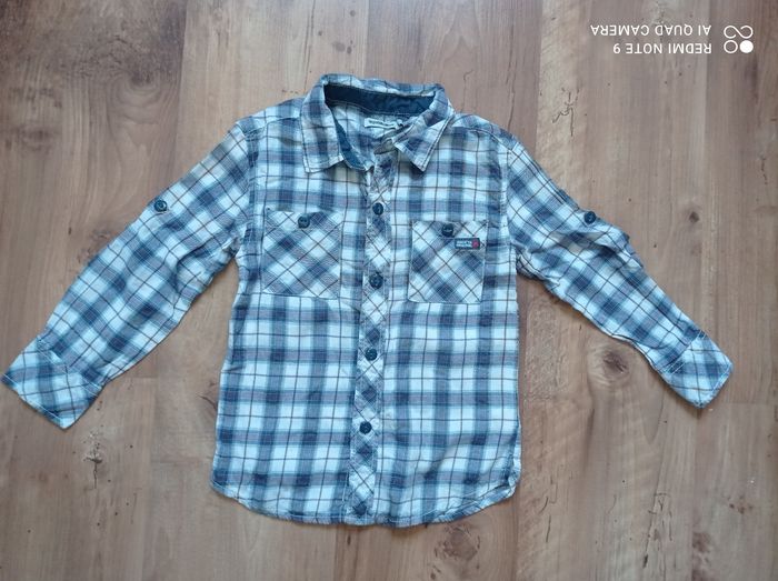 Chemise à grands carreaux dans les tons bleu, blanc et rouge.