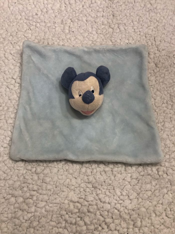 Doudou plat souris Mickey bleu ciel grelot Disney