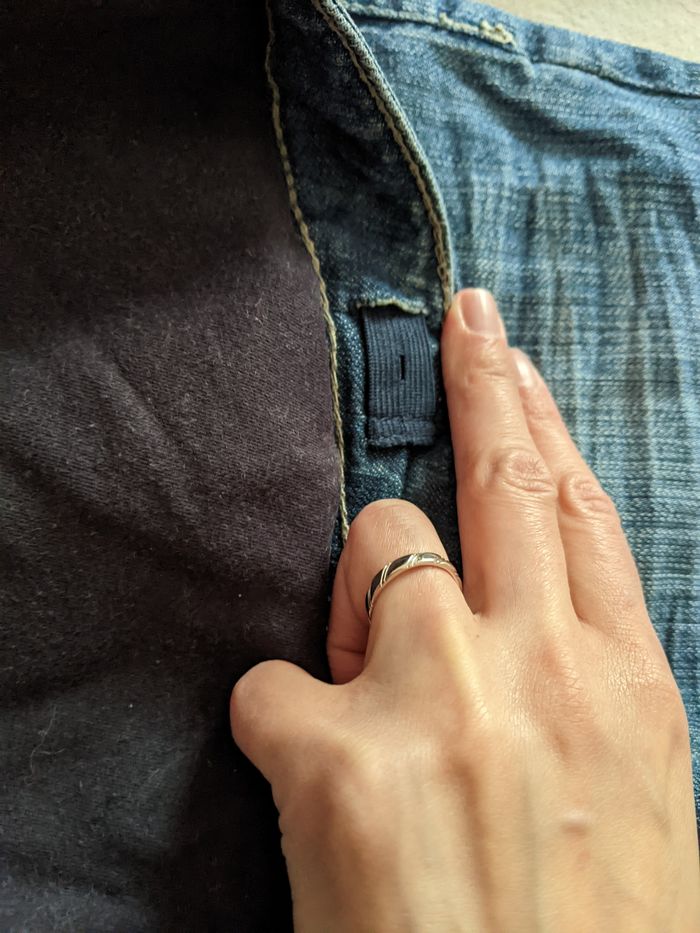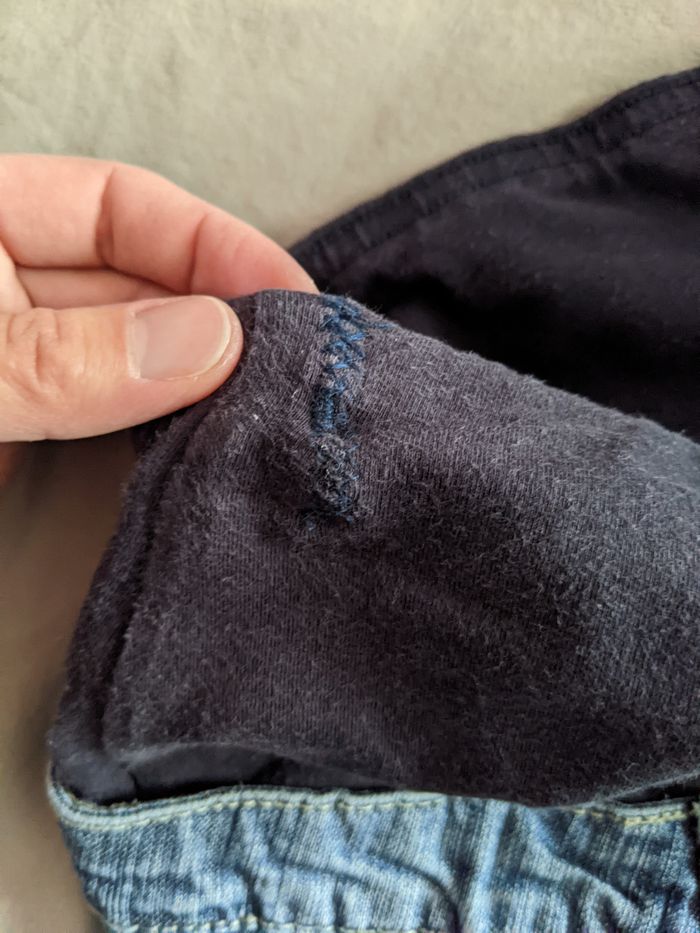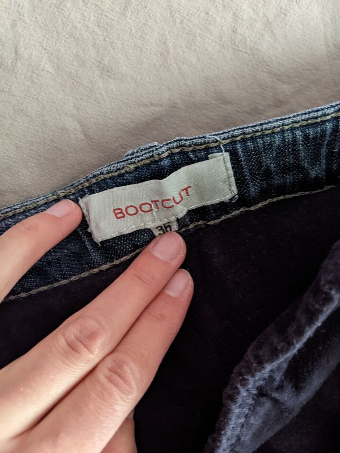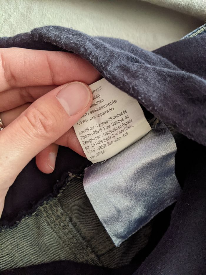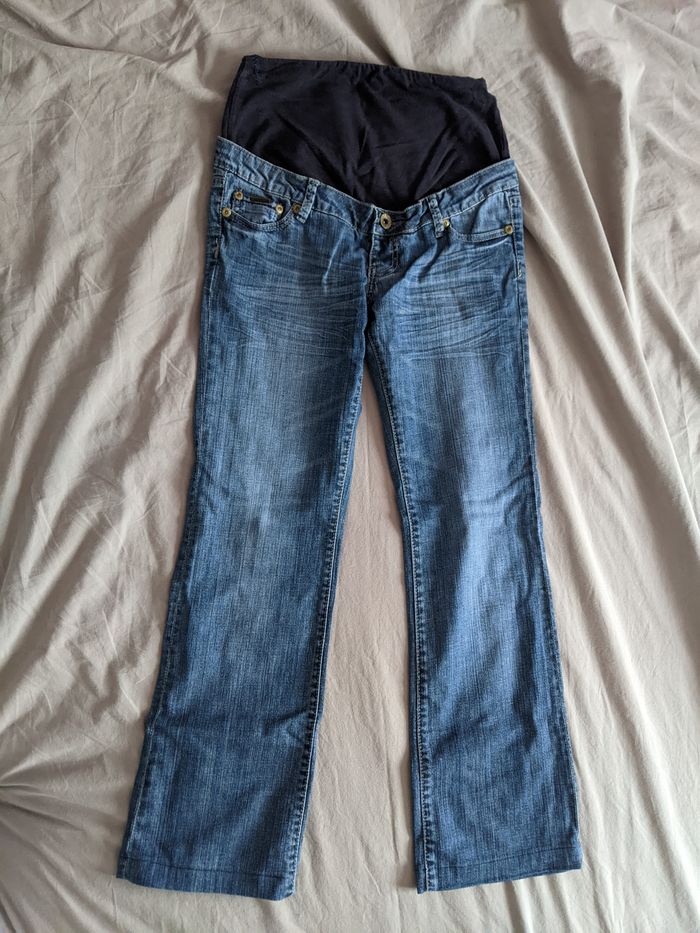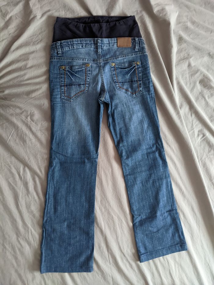 Jean de grossesse coupe bootcut Marque La Halle taille 36 La partie jean est en très bon état, la partie tissu sur le ventre a été réparée car elle s'était trouée (voir photo)