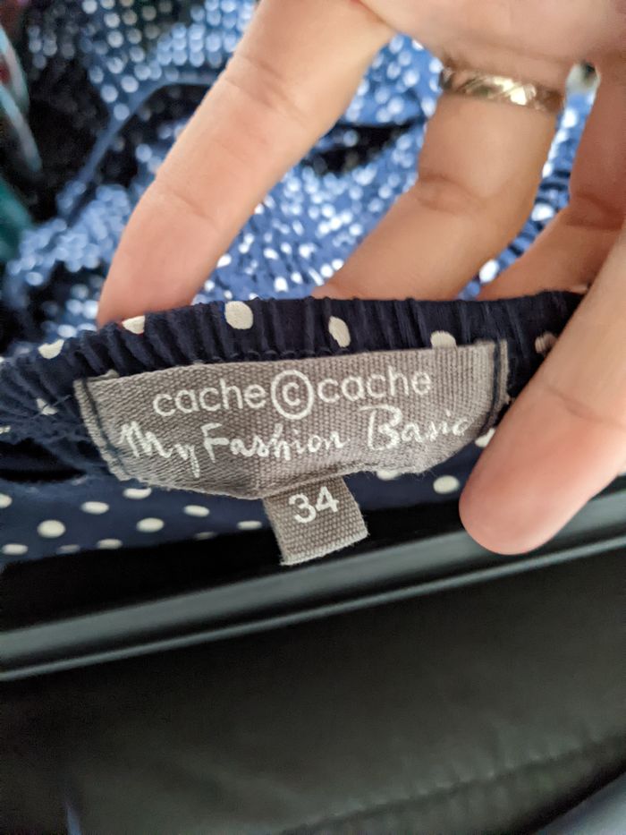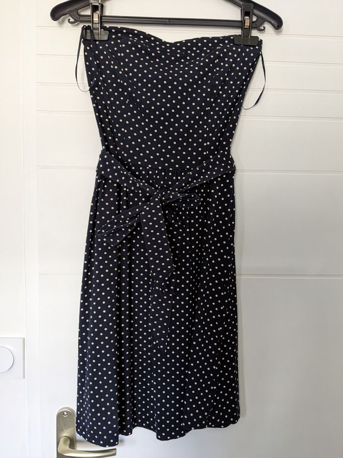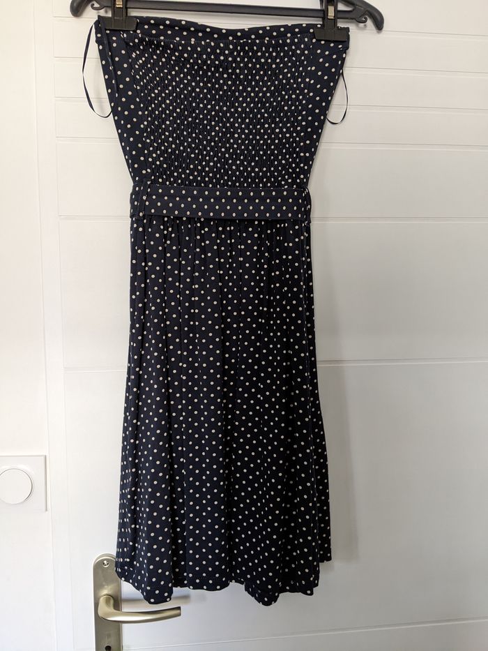 Robe bustier en matière stretch, marine avec pois blancs, avec ceinture du même tissu. Très bon état, marque Cache-cache taille 34