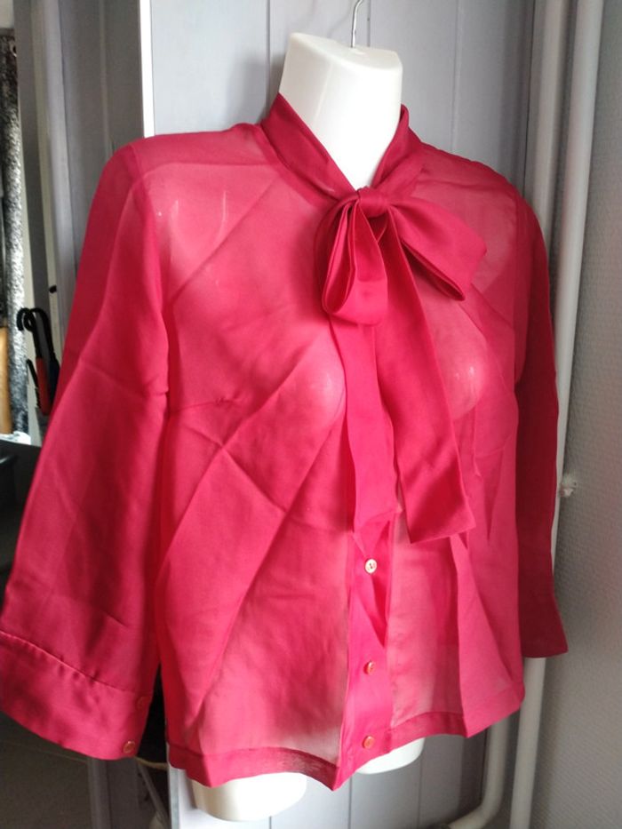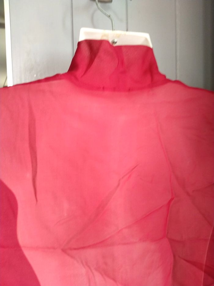 Très bonne état pour un vêtement d'époque (léger accro dans le dos voir photo). Convient à une taille 36. Manches 3/4, nœud à nouer au niveau du col et matière transparente.