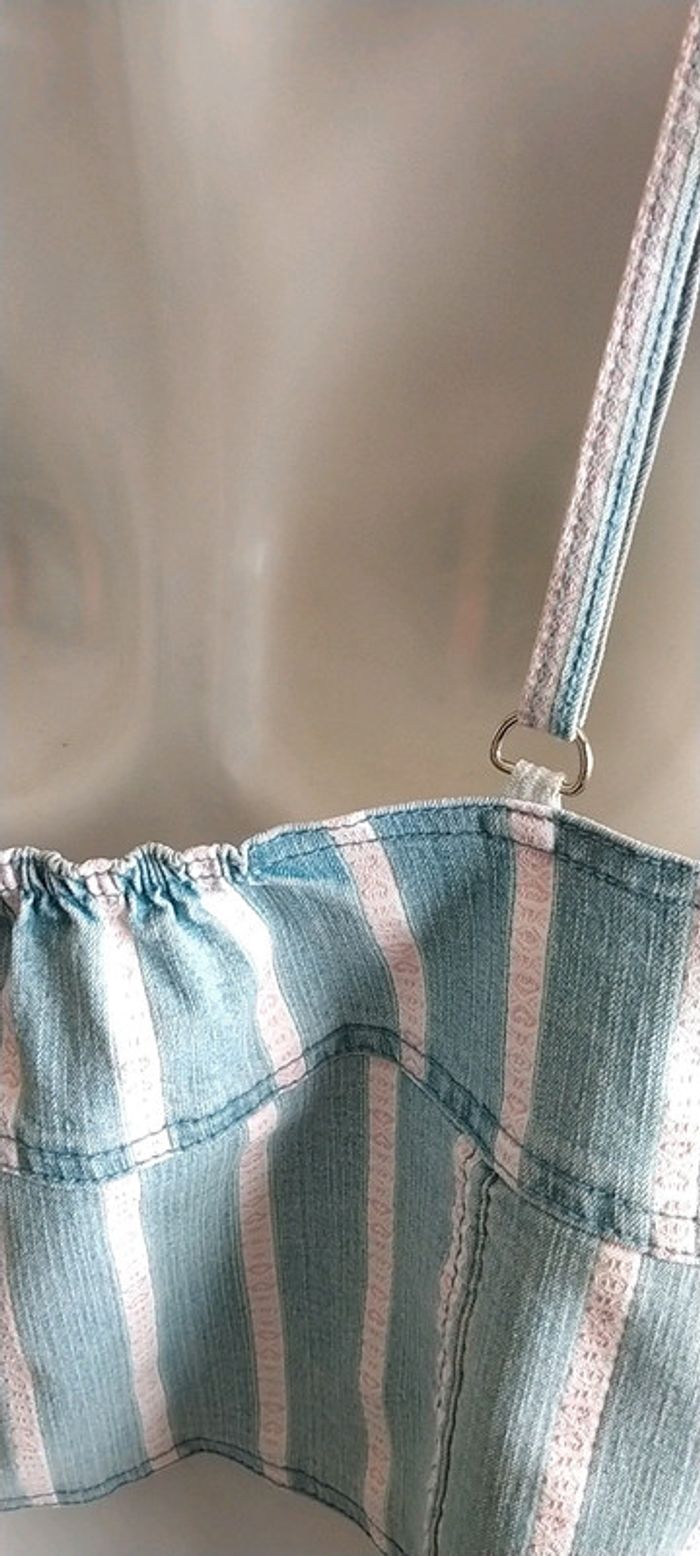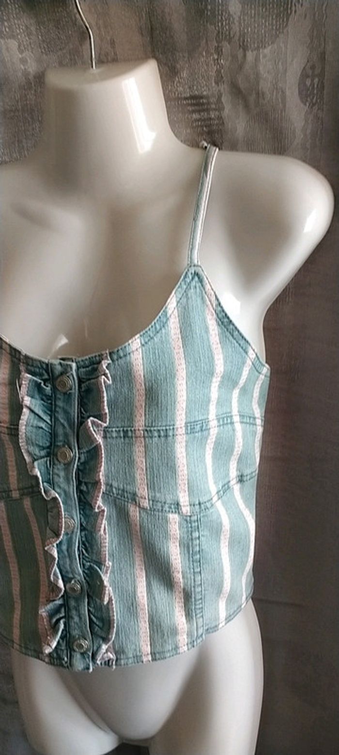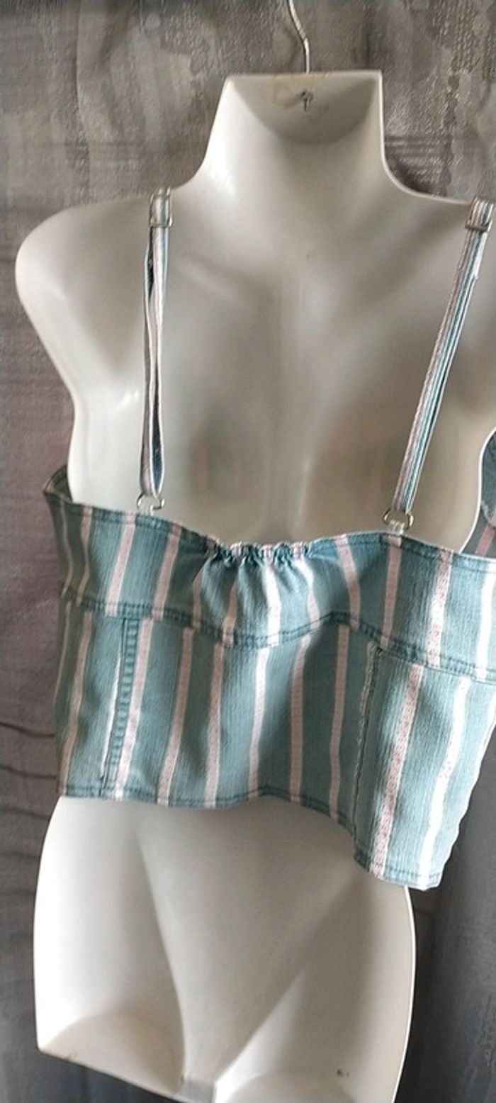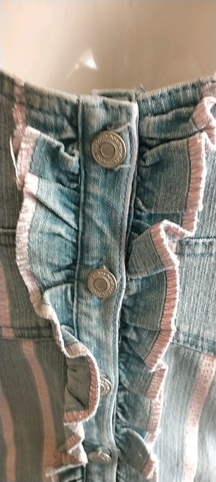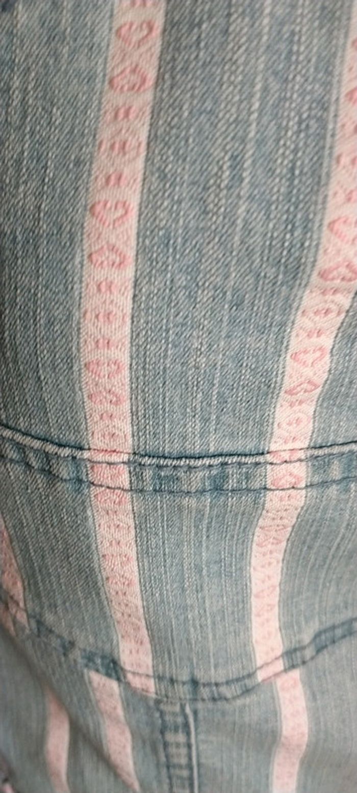 Porter, très bon état. Jean rayé avec motifs cœur rose. Bretelles réglables, taille 38/40.