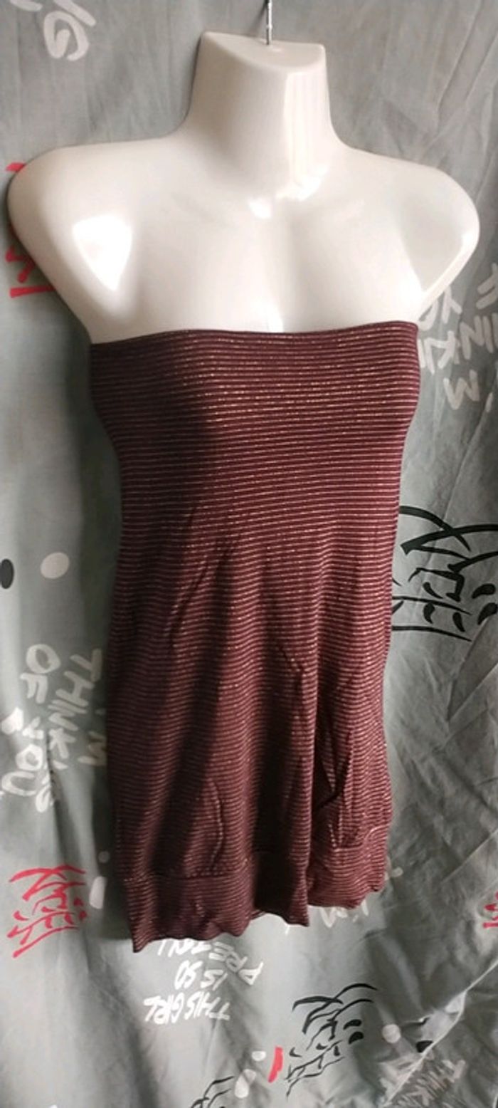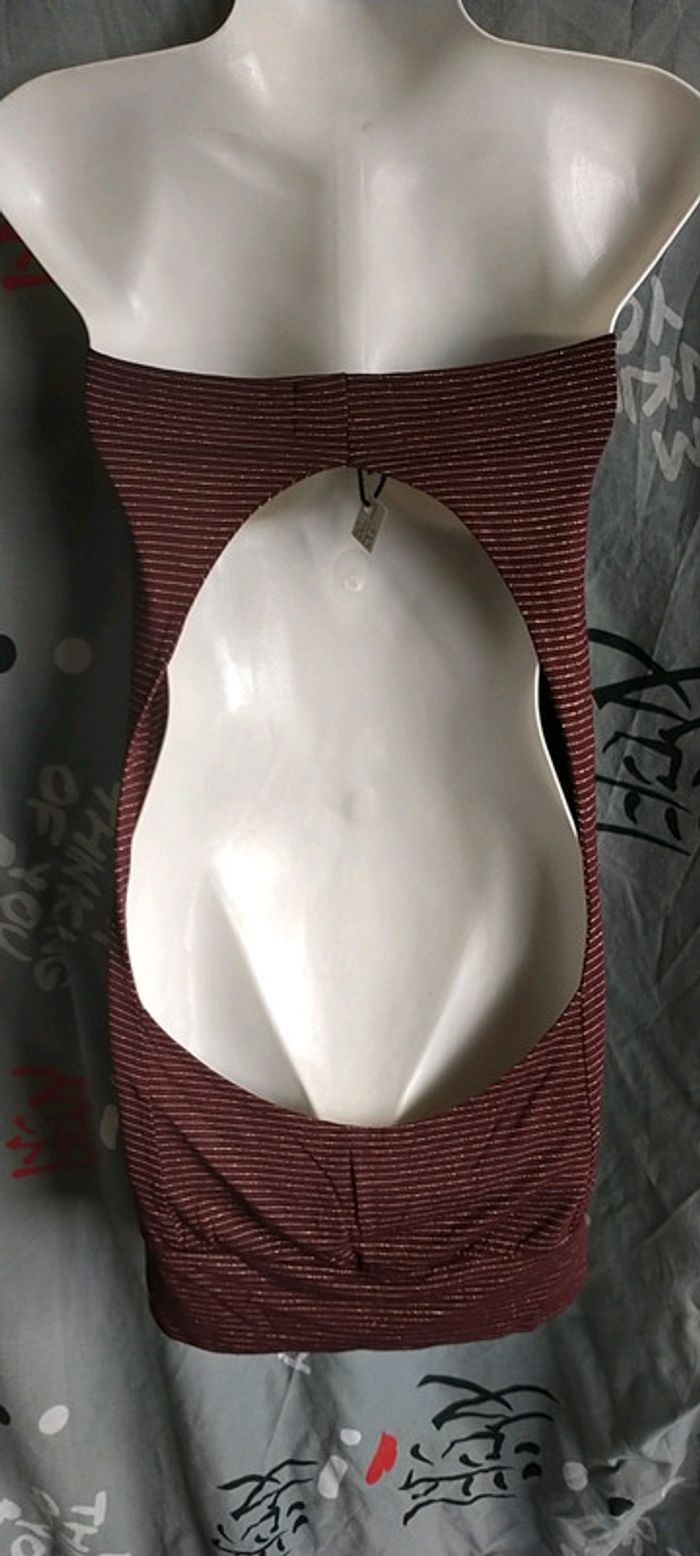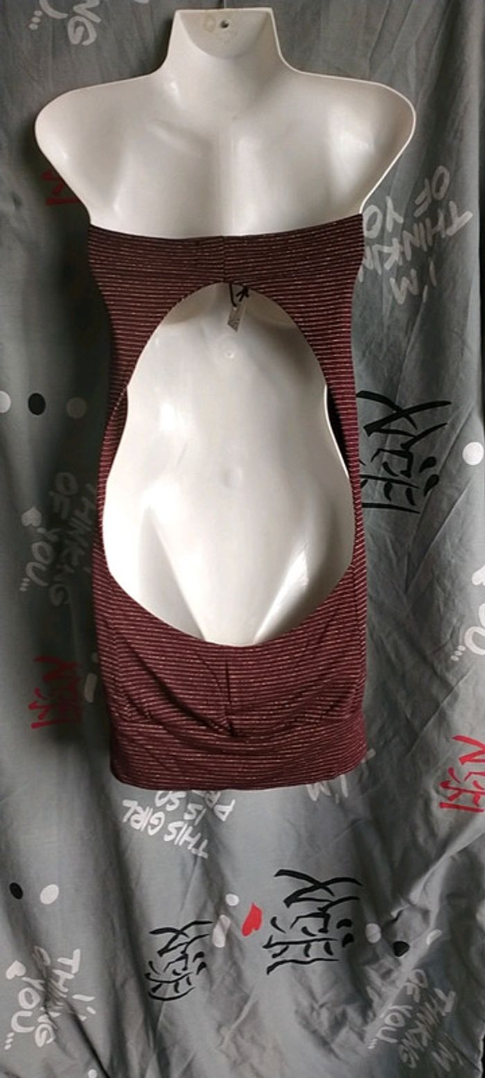 Porter une fois, impeccable. Sexy avec son grand dos nu. Couleur bordeaux avec rayures horizontales dorées.