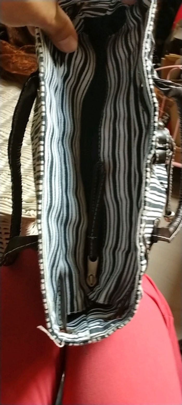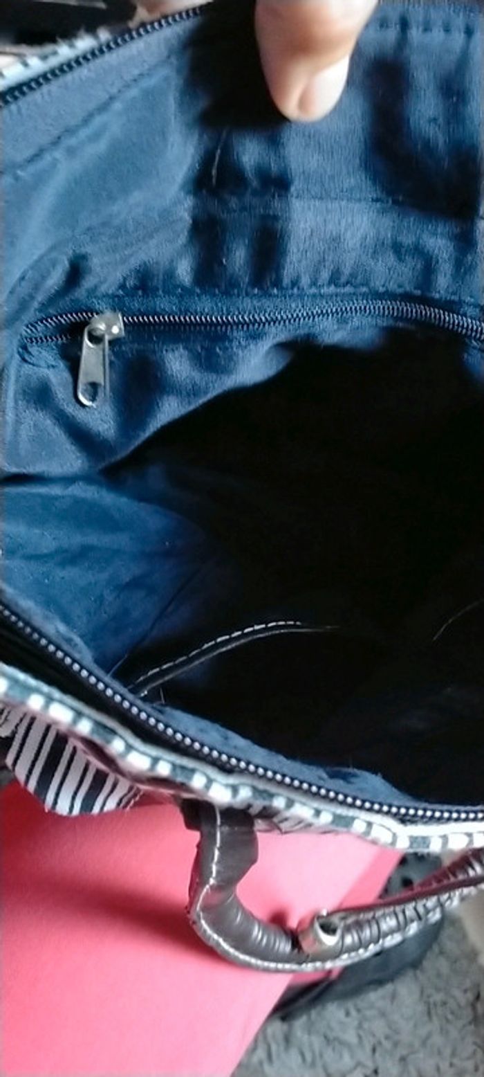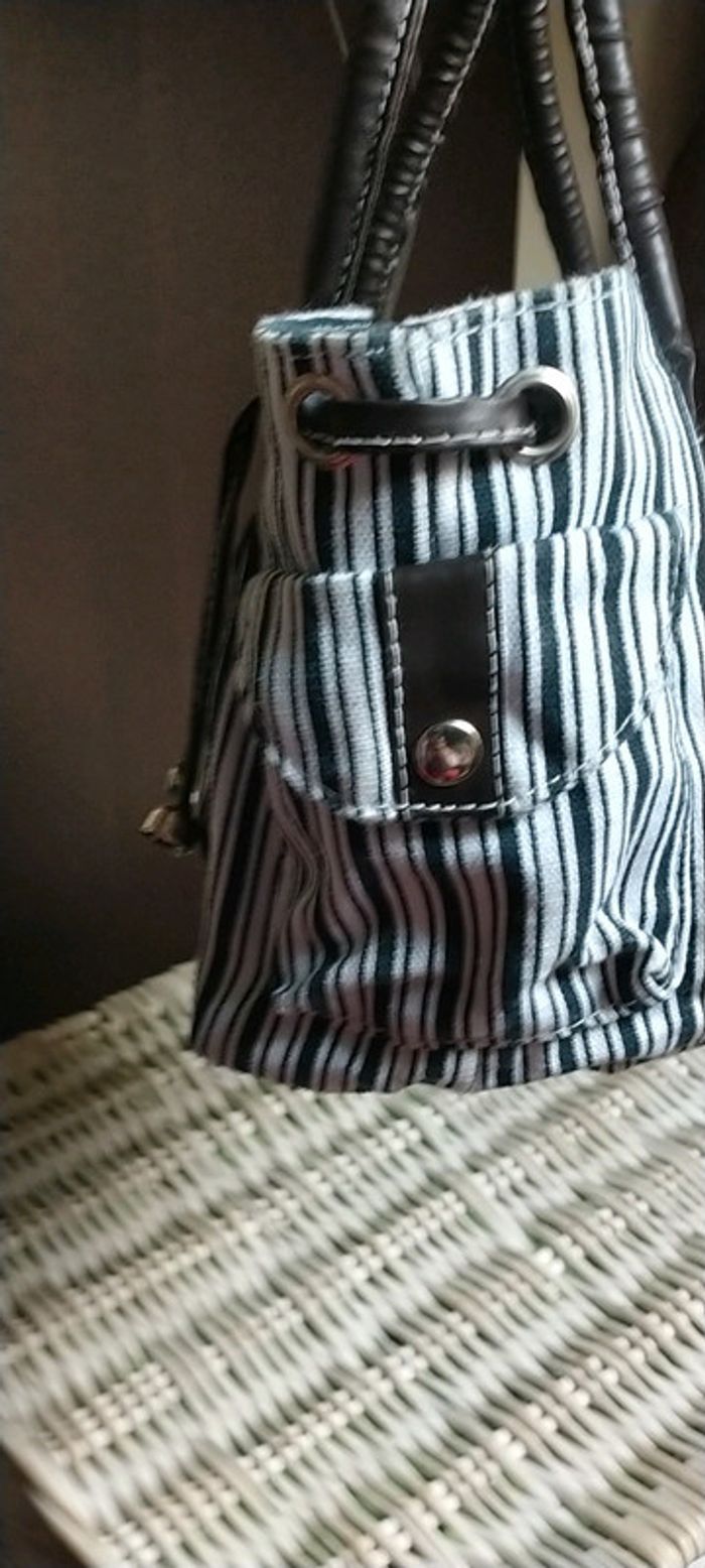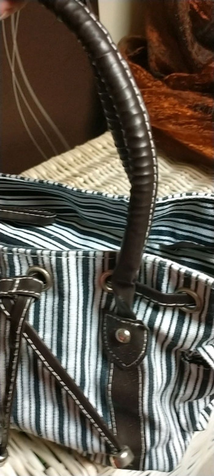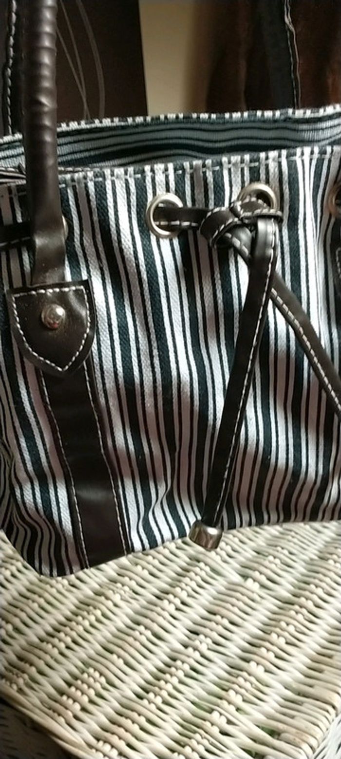 Très bon état, peut utiliser. Rayé bleu marine/blanc, anses marron. Dimensions: H 18 x L 19 x l 12 cm.