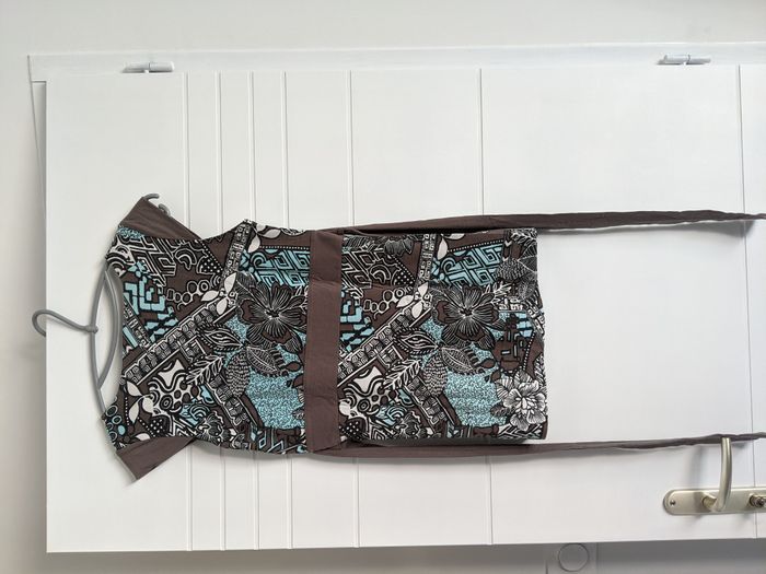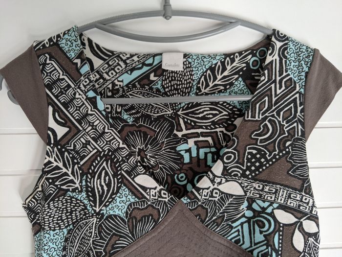 Haut manches courtes, turquoise et marron, avec lien sous la poitrine à nouer derrière Camaïeu Taille 36