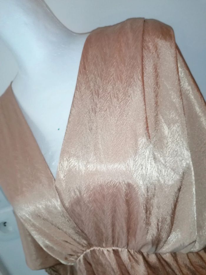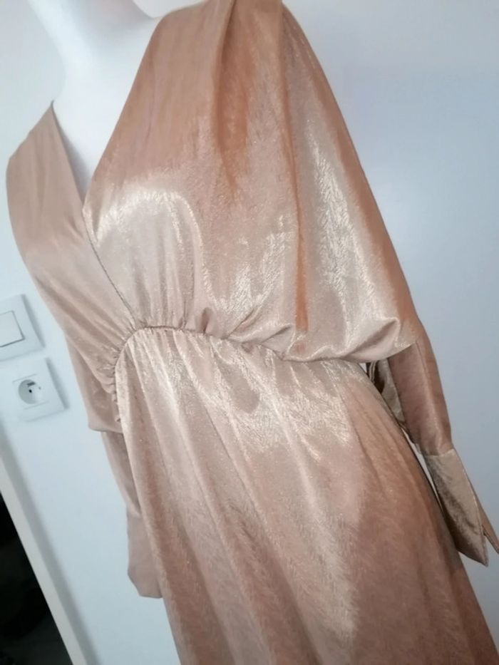 Jolie robe longue dorée brillante à la lumière aucun défaut élastique à la taille. jamais porté. Longueur environ 140cm mesure prise sur mannequin de la nuque à en bas.