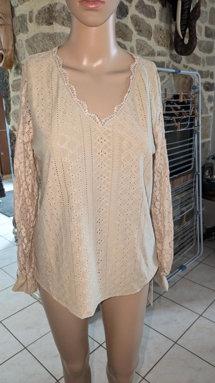 Haut à col en V en dentelle d'oeillets festonné taille XS/36 beige jamais porté - photo numéro 1