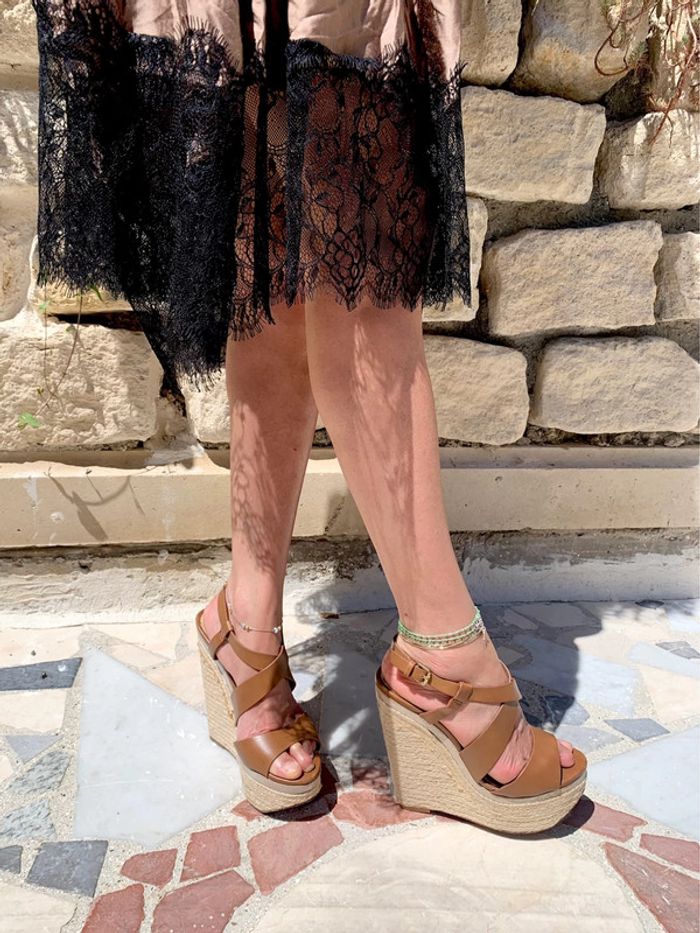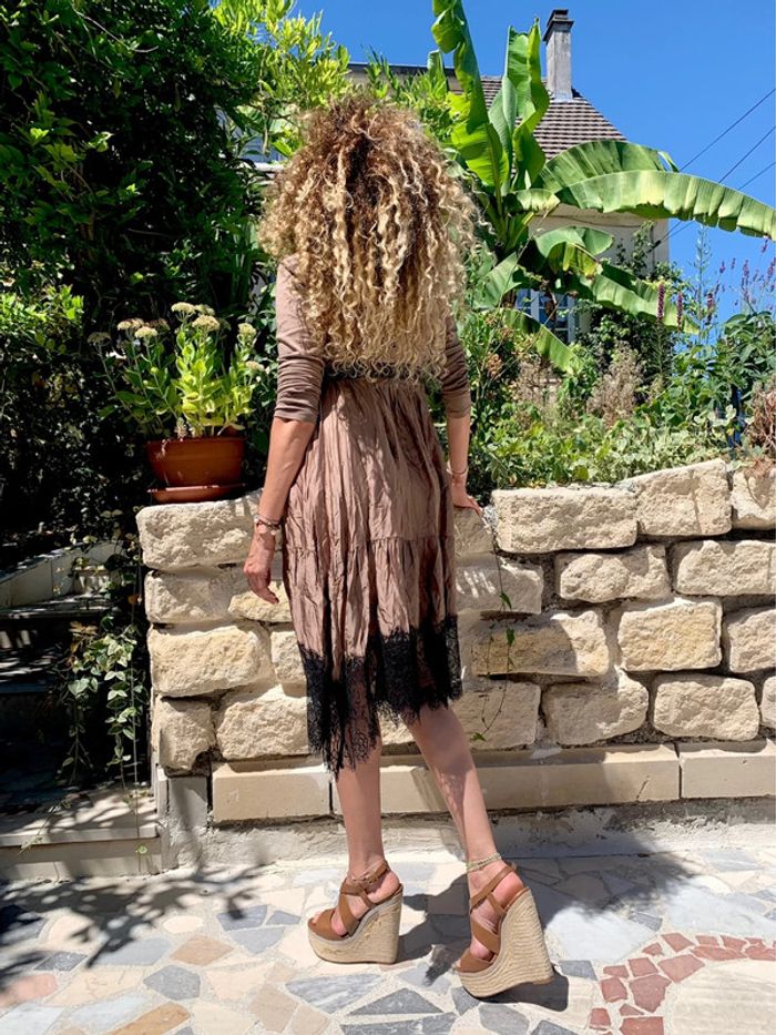 Très belle robe d’été satinée couleur moka Haut en coton hyper agréable Et bas satinée avec magnifique dentelle noire Taille unique One size Made in Italy