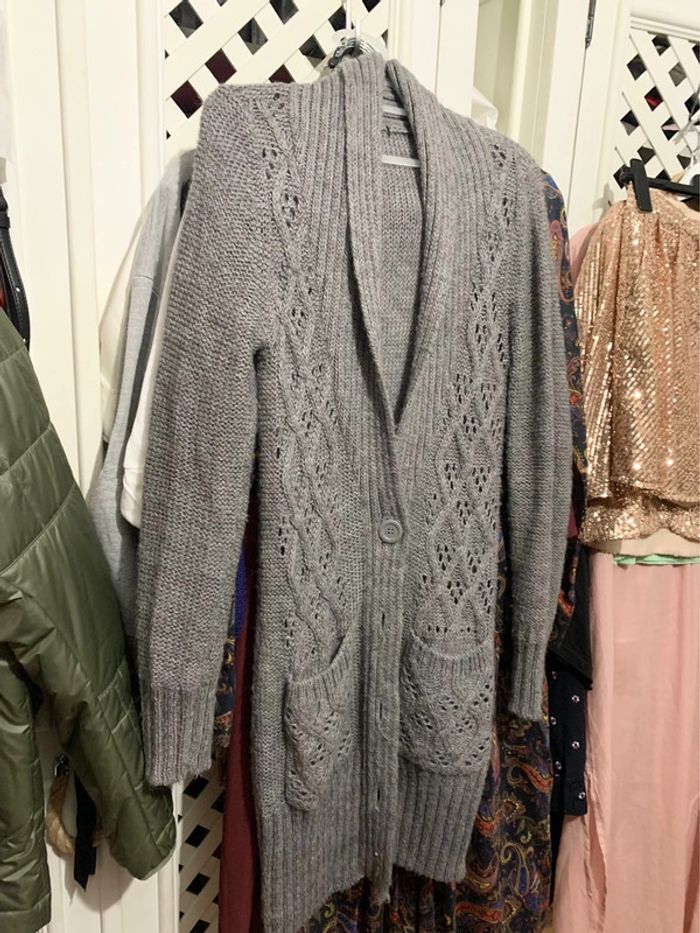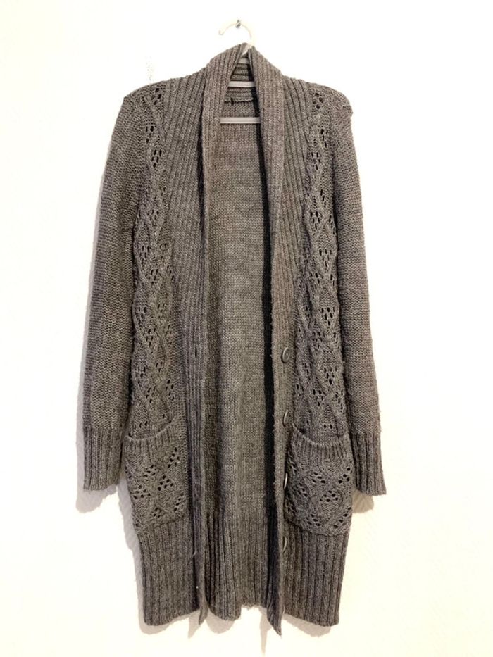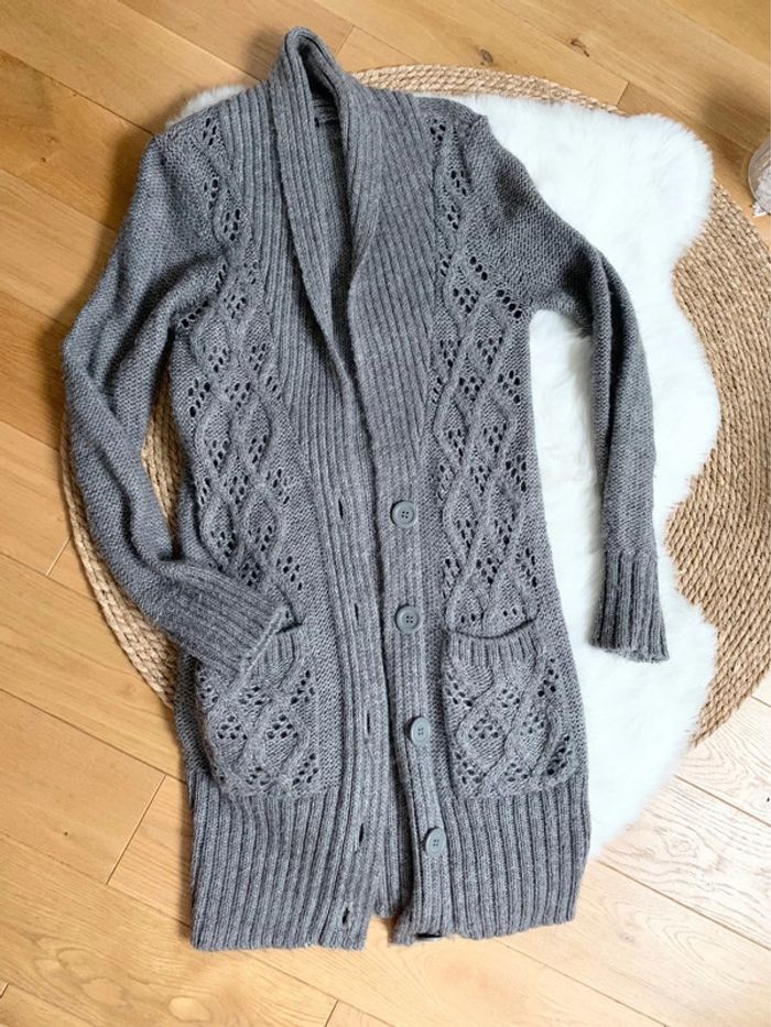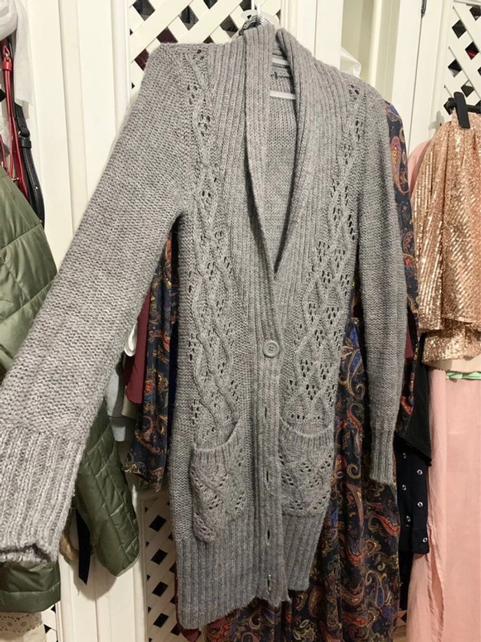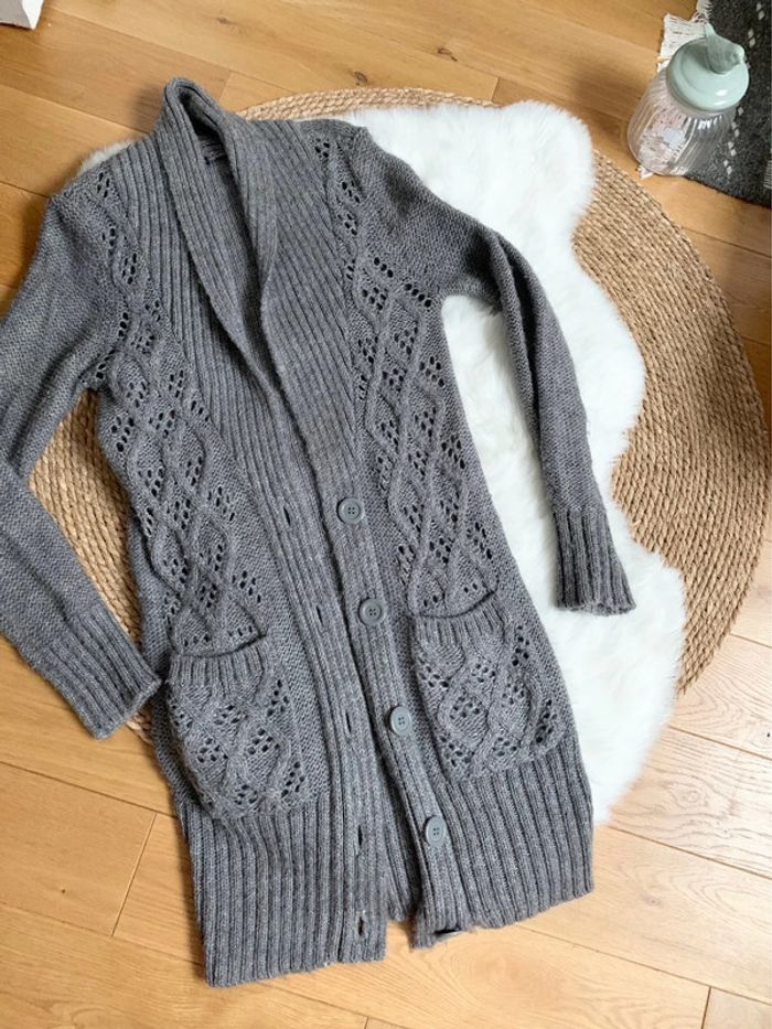très beau gilet en maille ajourée Vintage en alpaga mélangé de couleur gris taille S produit Vintage avec de jolis boutons #alpaga #giletenmaille #pulldhiver