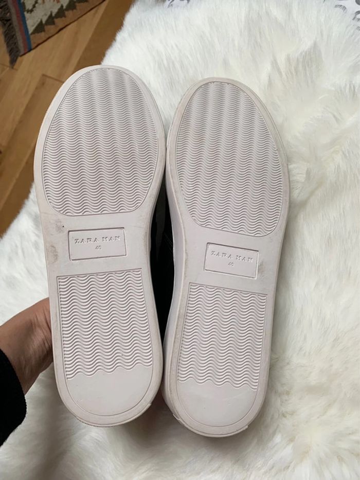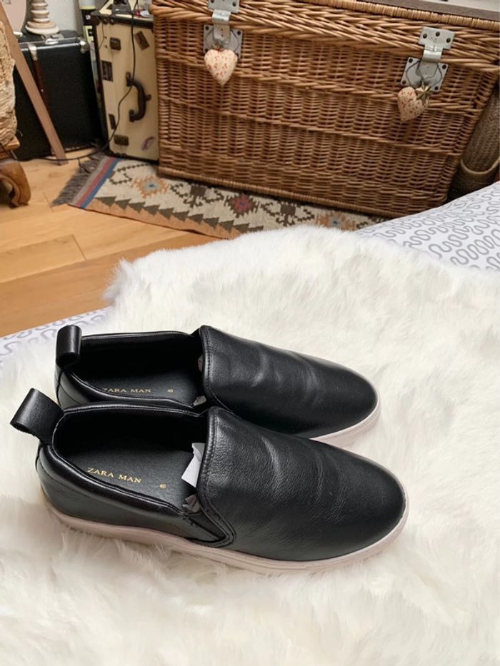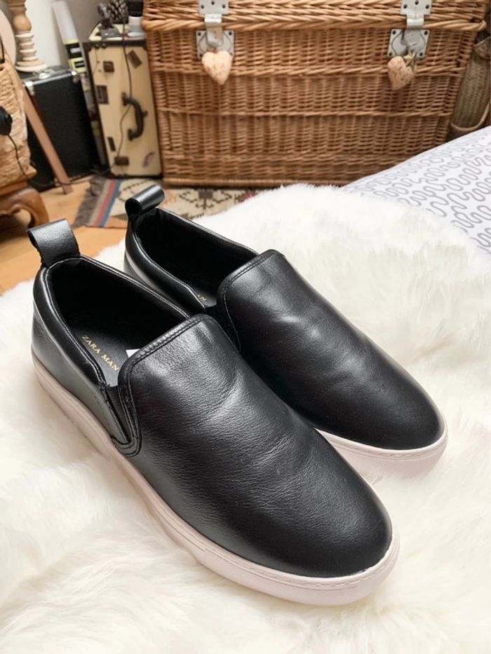 slippers / slip on en cuir Noir Zara pointure 40 parfaite pour accompagner une tenue de soirée décontractée et stylée mixte #zara #zaramen #pointure40 #slipperszara40 #sliponzara #basketnoir #chaussurezara #chaussurezaranoir