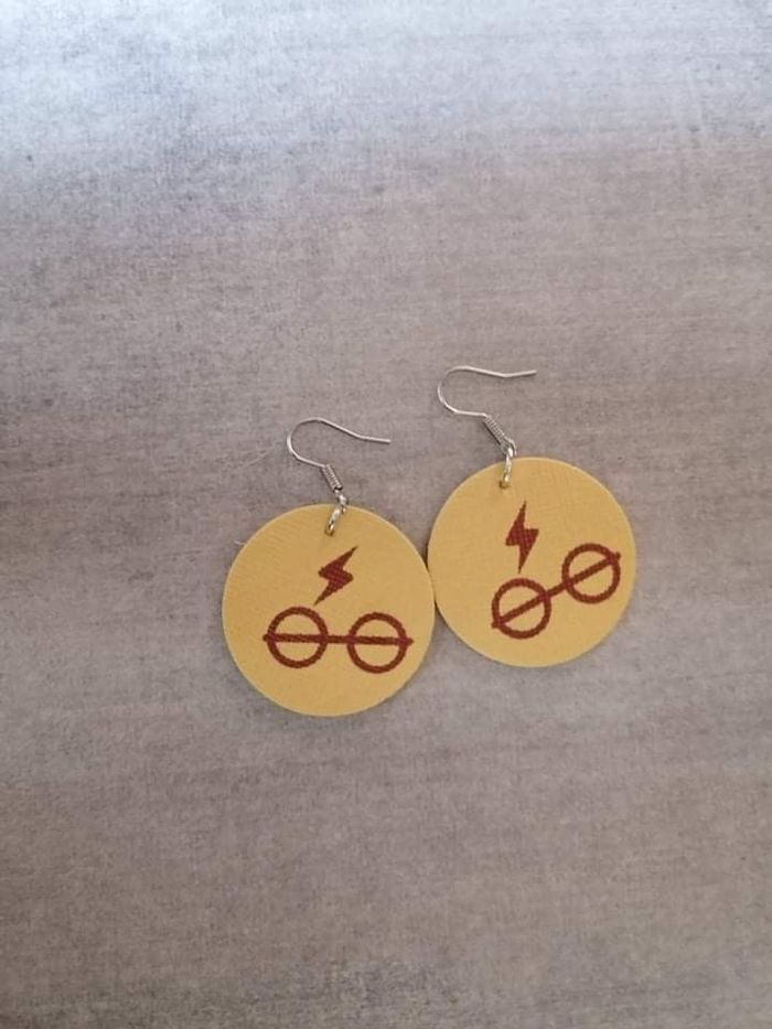 Boucles d'oreilles argentées avec des pendent Harry Potter faits main en tissu et bois de 3cm de diamètre