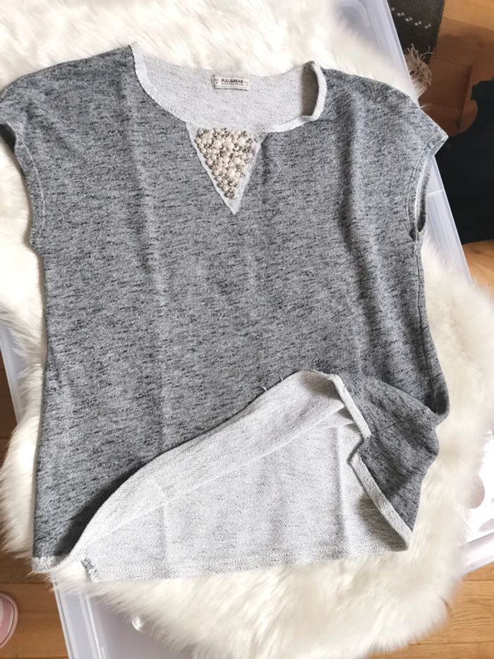 Très beau pull manches courtes avec Plastron en perles devant en gris chiné Taille S, marque Pull&Bear Profitez pour faire 1 lot dans mon dressing pour économiser sur les frais de ports et activer la réduction automatique 😉😍🌷 #pulldété #pull&bear #hautpull&bear