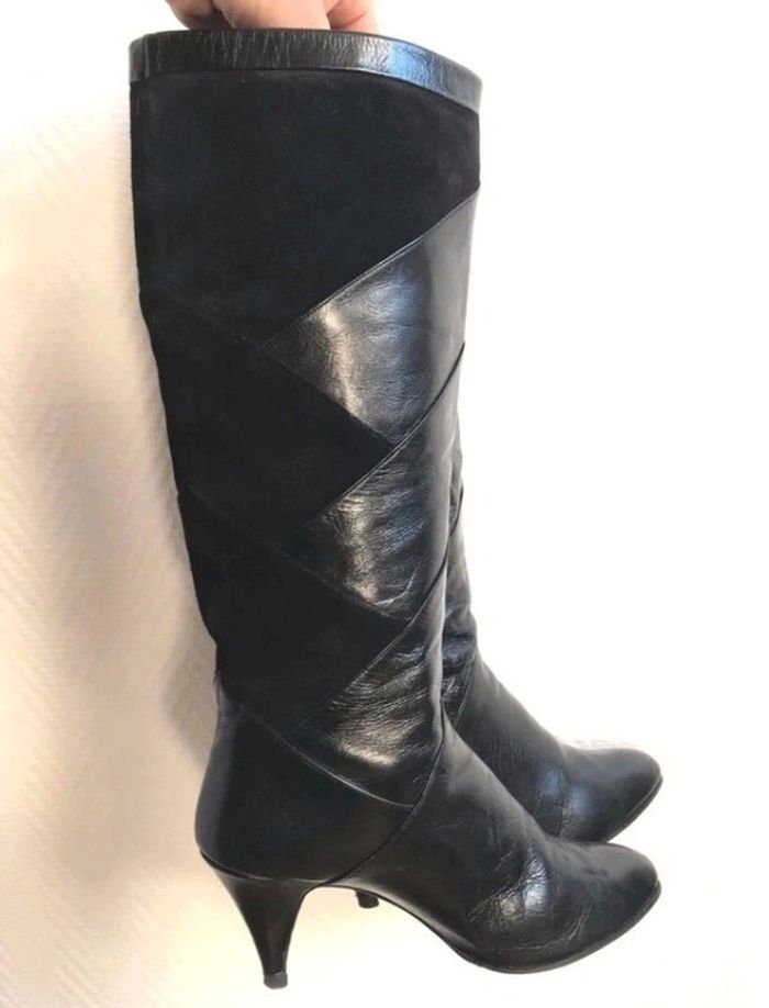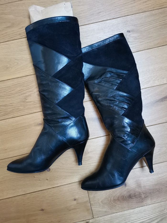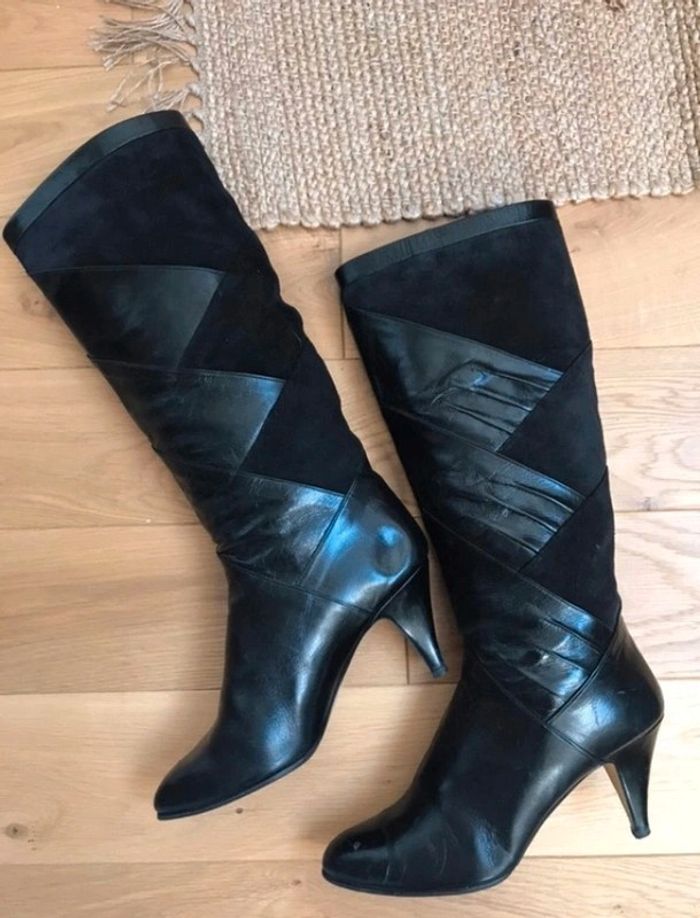Très belles bottes hautes en 100% cuir Couleur Noir Made In France 🇫🇷 Produit Vintage authentique Joli drapé en cuir lisse travaillé sur du cuir suédé velours noir Découpe originale et unique 😍 Pointure 37,5  (6 1/2)  Véritable produit vintage authentique!  ❤️ Made in France 🇫🇷  a saisir 120€ 😍😍😍😍 Mesures: Hauteur de tige 38cm  Tour de mollet 39cm Talon 7,5 cm #frenchvintageaddict #stylealafrancaise #vintage_botte #vintage_retro #stylevintage #styleretro #madeinfrance #french_vintage_addict