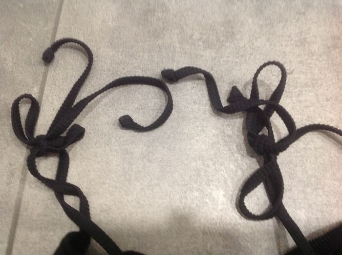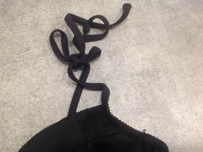 Soutien-gorge / haut de maillot de bain, de taille 80C, de couleur noire, de marque H&M. Tissu côtelé. Fermoir métallique dans le dos. Armatures sous les bonnets. Bretelles réglables. Bretelles amovibles en partie, permettant un nouage sur les épaules ou derrière le cou. Composition : - extérieur : 90% polyamide, 10% élasthanne - doublure : 100% polyester. Très bon état.