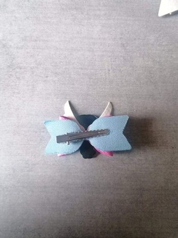 Pince à cheveux jamais portée. La base est bleue pailletée, le milieu est rose et les ailes ainsi que l'auréole sont argentées à reflet arc en ciel