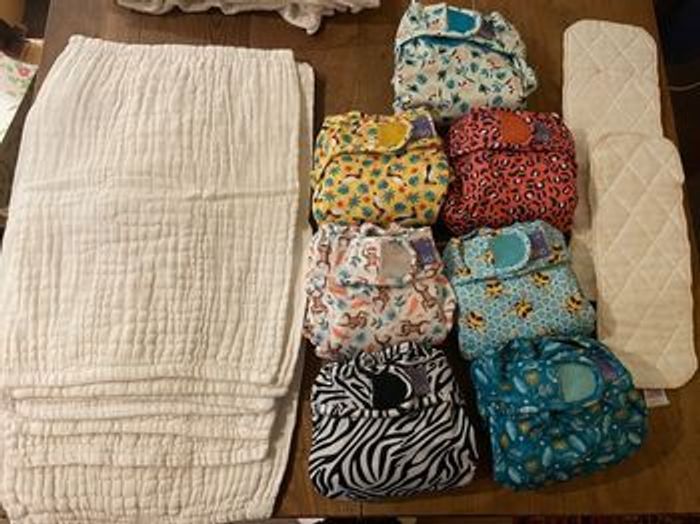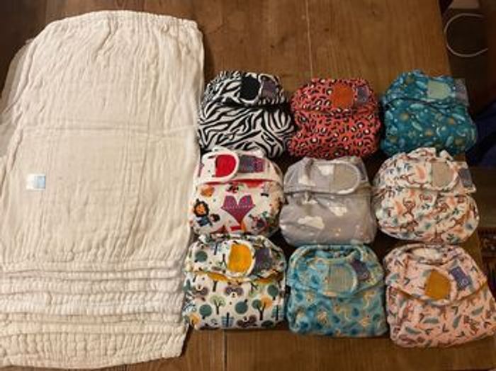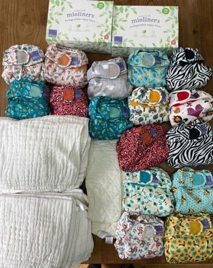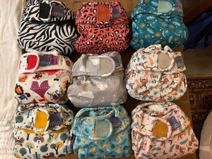 Lot de couches lavable bambino mio 9 couches miosoft tailles 1 (-9kg) 7 couches miosoft taille 2 (+9kg) 34 inserts (langes) bambino mio 3 inserts booster bambino mio 4 boite de mioliners neuves (100 voiles de protection par boite) et une boite ouverte Elles étaient déjà d'occasion quand nous les avons achetées, mais elles ont toujours été bien entretenues (routine de lavage respectée). Certains langes ont quelques tâches légères malgré les nettoyages. 120 euros