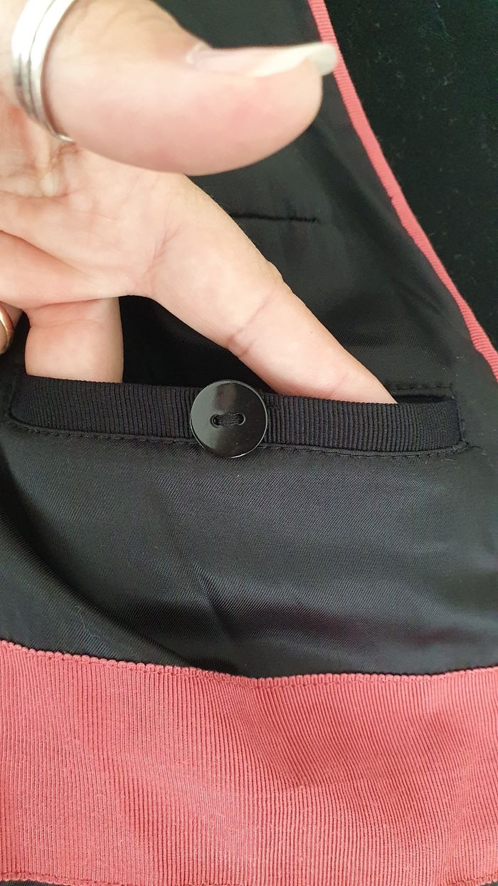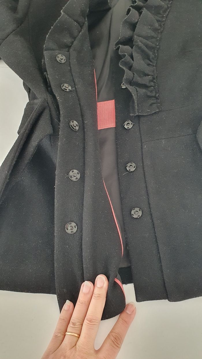Veste noir en trés bon état Elle se ferme avec des pressions et une ceinture Avec une pochette intérieure un bouton de rechange