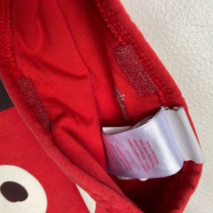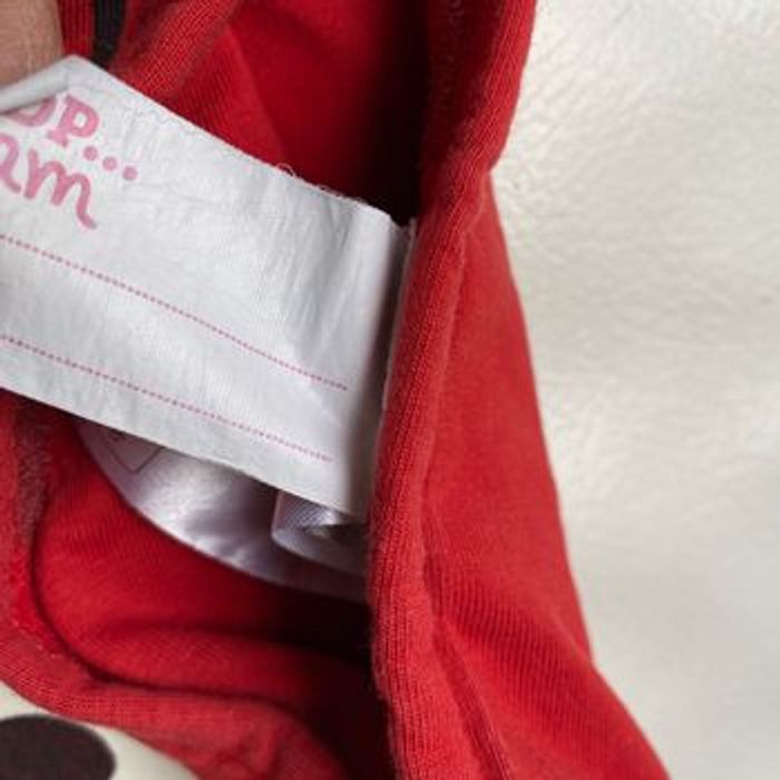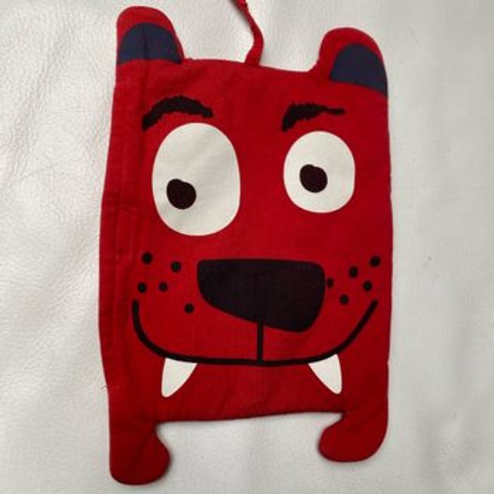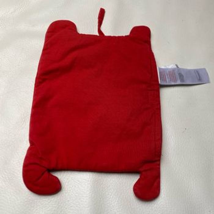 Pochette doudou rouge du pareil au même Environ 18 x 28 cm avec les oreilles et les pattes Légèrement ouatinée Imprimé chien Petite attache Étiquette pour inscrire le nom et prénom