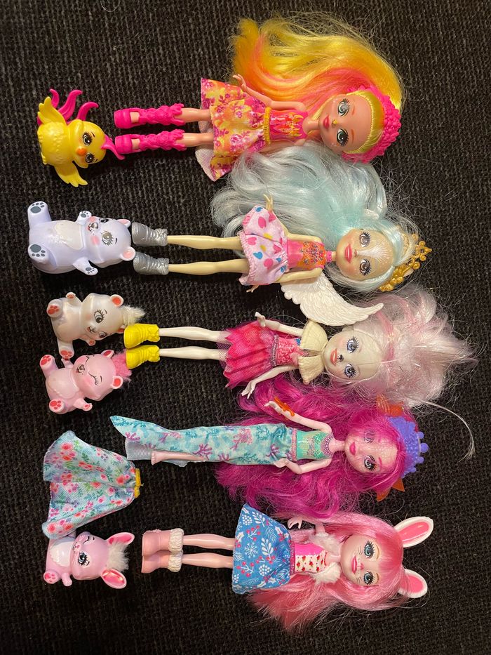 Lot de 4 poupées Enchantimals ac figurines . + 1 poupée offerte ( celle aux chaussures jaune car a eu sa tête de recollée , je ne peux donc pas garantir que ça tienne) Tout ce que comprend la photo .